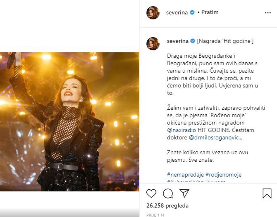 Znate koliko sam vezana uz ovu pjesmu. Sve znate", napisala je Severina, a u komentarima su joj se javili brojni pratitelji da joj čestitaju.