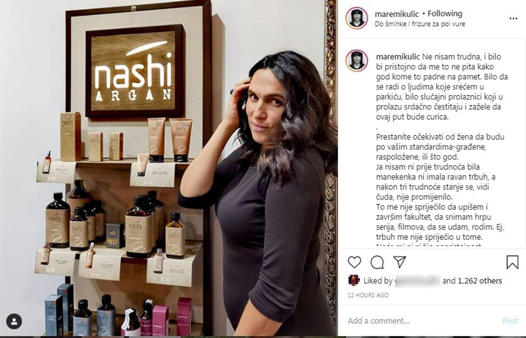 To me nije spriječilo da upišem i završim fakultet, da snimam hrpu serija, filmova, da se udam, rodim. Ej, trbuh me nije spriječio u tome. Neće mi ni ničija nepristojnost spriječiti da se osjećam dobro i da budem zadovoljna, imam nogu koje se ne bi posramile ni puno mlađe od mene (potpuno nebitna činjenica, al nek se zna), napisala je glumica.
