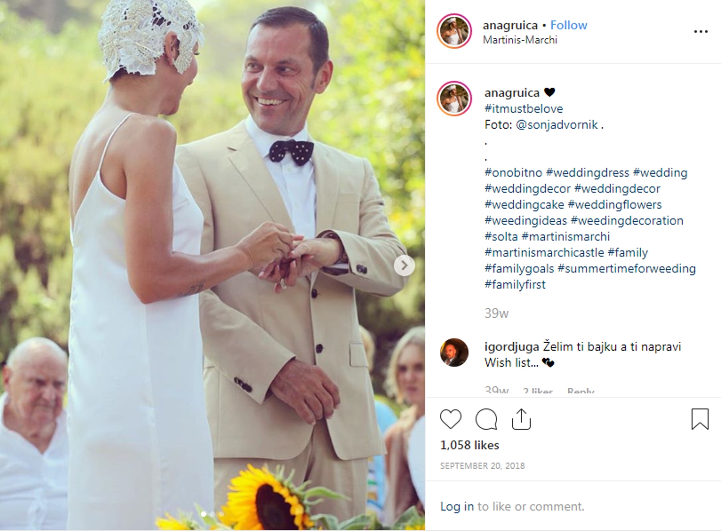 – Cijeli ovaj mjesec mislila sam kako ovo mora biti "tajno". Kako je cool (konačno) čuvati svoju intimu, a i planiramo crkveno vjenčanje, pa je ovo trebalo biti samo za naše oči i dušu. Ali kako je vrijeme odmicalo, shvatila sam kako svaki dan gledam slike, ali svaki, da je toliko ljubavi utkano u ovo, da je toliko lijepe, iskrene emocije pokazano na taj dan da je glupo tajiti nešto tako zdravo i  pozitivno – napisala je Ana na Instagramu nakon vjenčanja.