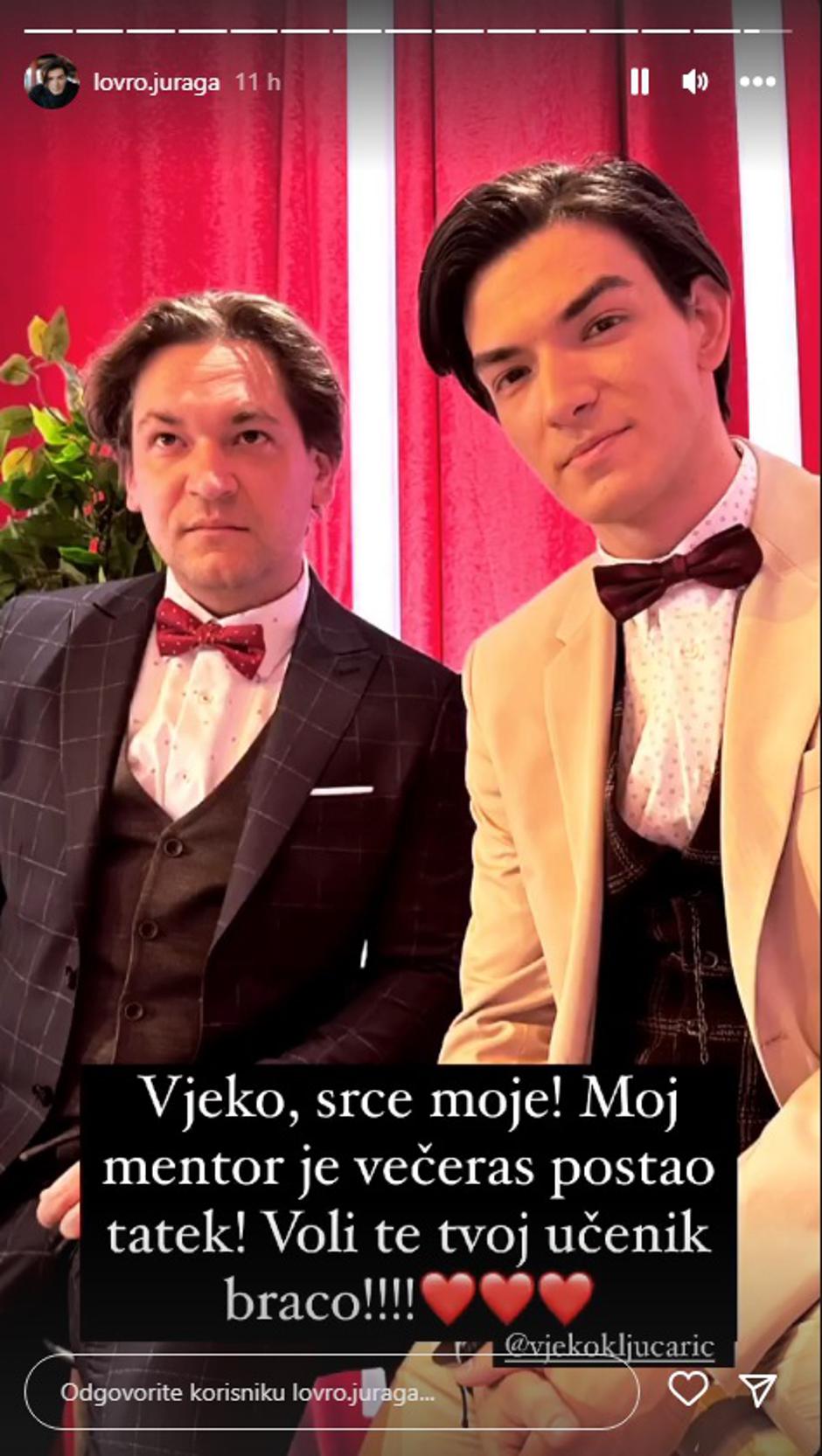 - Vjeko, srce moje! Moj mentor je večeras postao tatek, voli te tvoj učenik braco - napisao je Juraga uz zajedničku fotografiju s Vjekom.