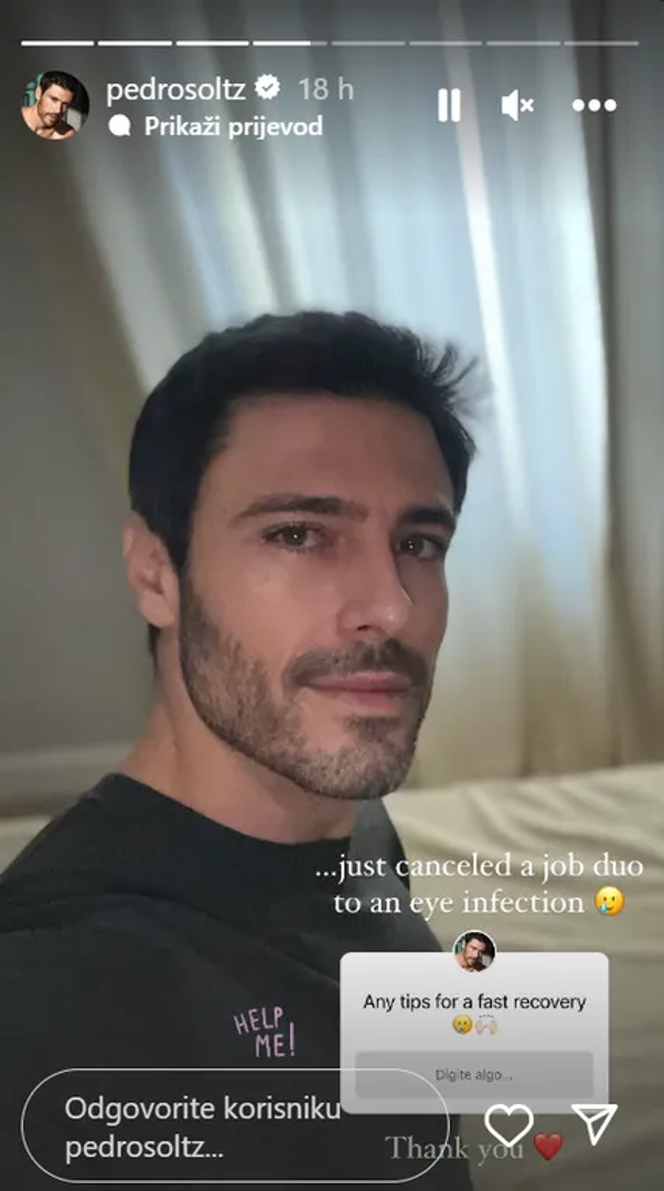 Poznati hrvatski maneken i glumac kojeg trenutno gledamo u RTL-ovoj seriji "San snova" Pedro Soltz požalio se da ima problem s infekcijom oka, zbog kojeg je morao otkazati i dogovoreni posao taj dan. Na svojoj Instagram priči objavio je fotografiju uz koju je napisao: