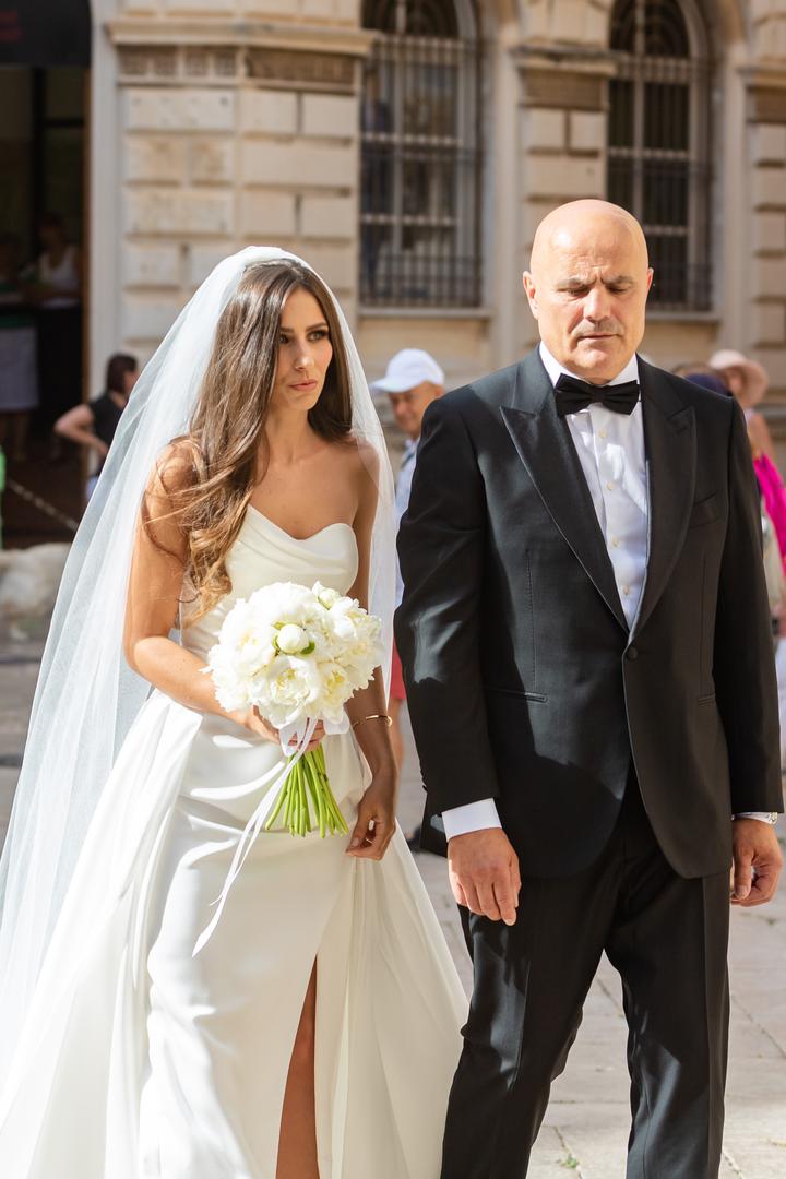 Dominik je za ovaj važan dan odabrao crni smoking s leptir mašnom, dok je mladenka zablistala u elegantnoj vjenčanici s dubokim prorezom, a u rukama je nosila buket bijelih božura.