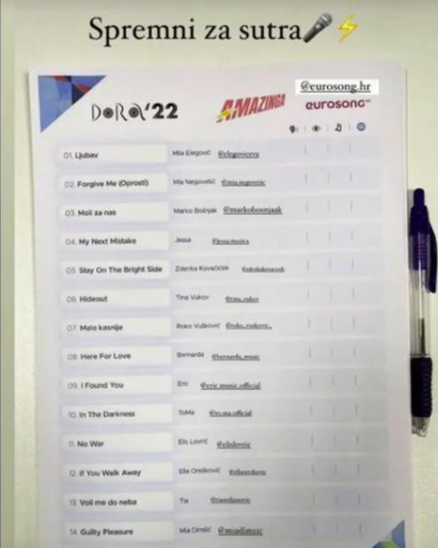 Fanovima se javila i pjevačica Tina Vukov koja je pozirala ispred zida na kojem je logo Dore 2022., te napisala posljednje pripreme u tijeku. Riječanka se na Doru vraća nakon 16 godina pjesmom 'Hideout' koju potpisuju Rejhan Okanović i Josipa Vujević te Tomislav Gojanović.