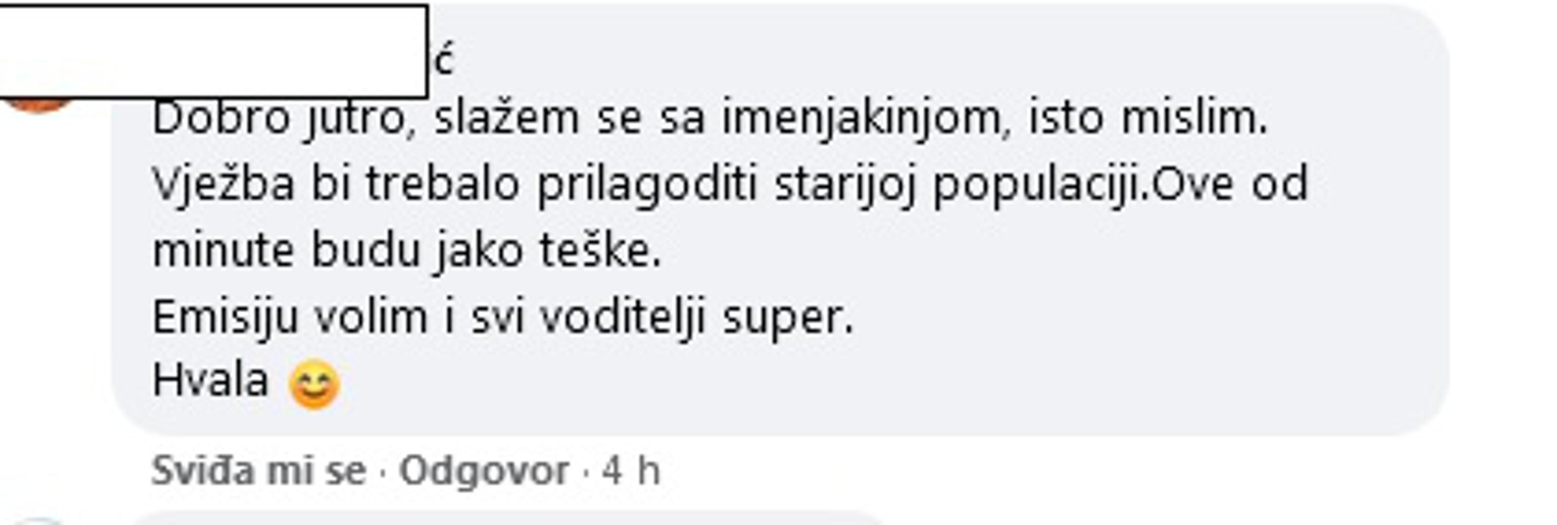 "Slažem se s imenjakinjom, isto mislim. Vježbu bi trebalo prilagoditi starijoj populaciji. Ove od minute budu jako teške. Emisiju volim i svi voditelji su super", nadovezala se druga.