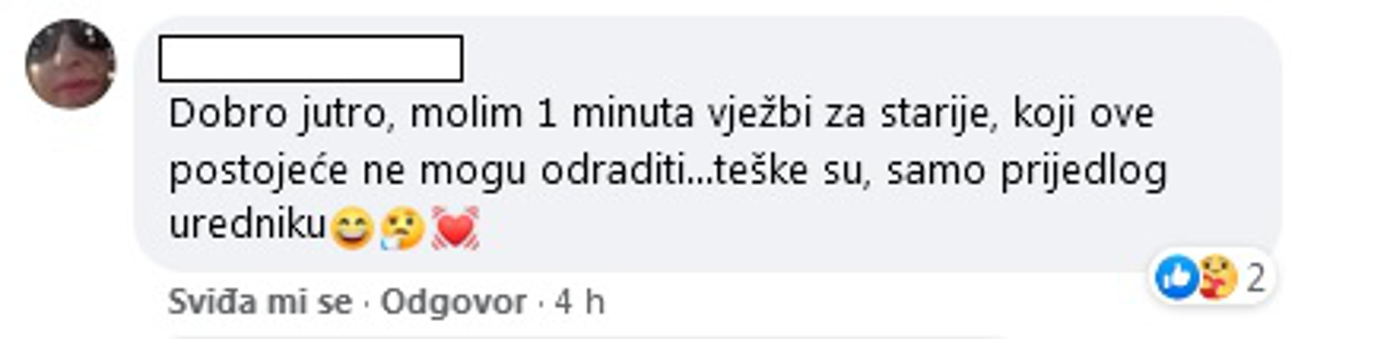 "Dobro jutro, molim 1 minuta vježbi za starije, koji ove postojeće ne mogu odraditi... teške su, samo prijedlog uredniku", poručila je jedna od gledateljica.