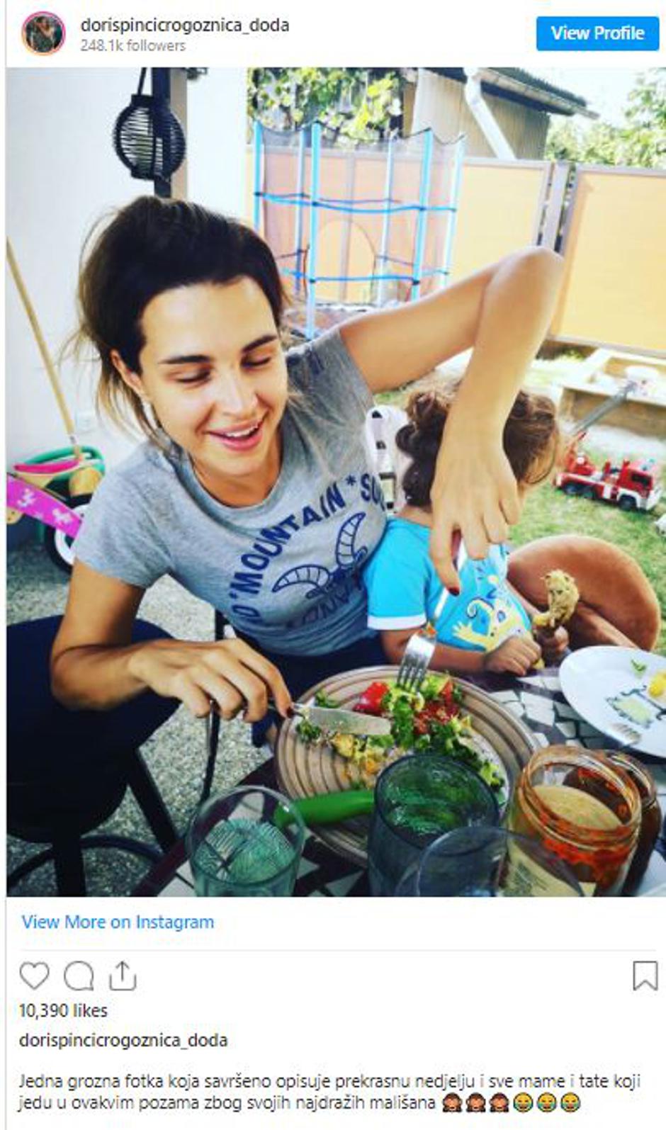 ''Jedna grozna fotka koja savršeno opisuje prekrasnu nedjelju i sve mame i tate koji jedu u ovakvim pozama zbog svojih najdražih mališana’' napisala je Doris uz fotku.