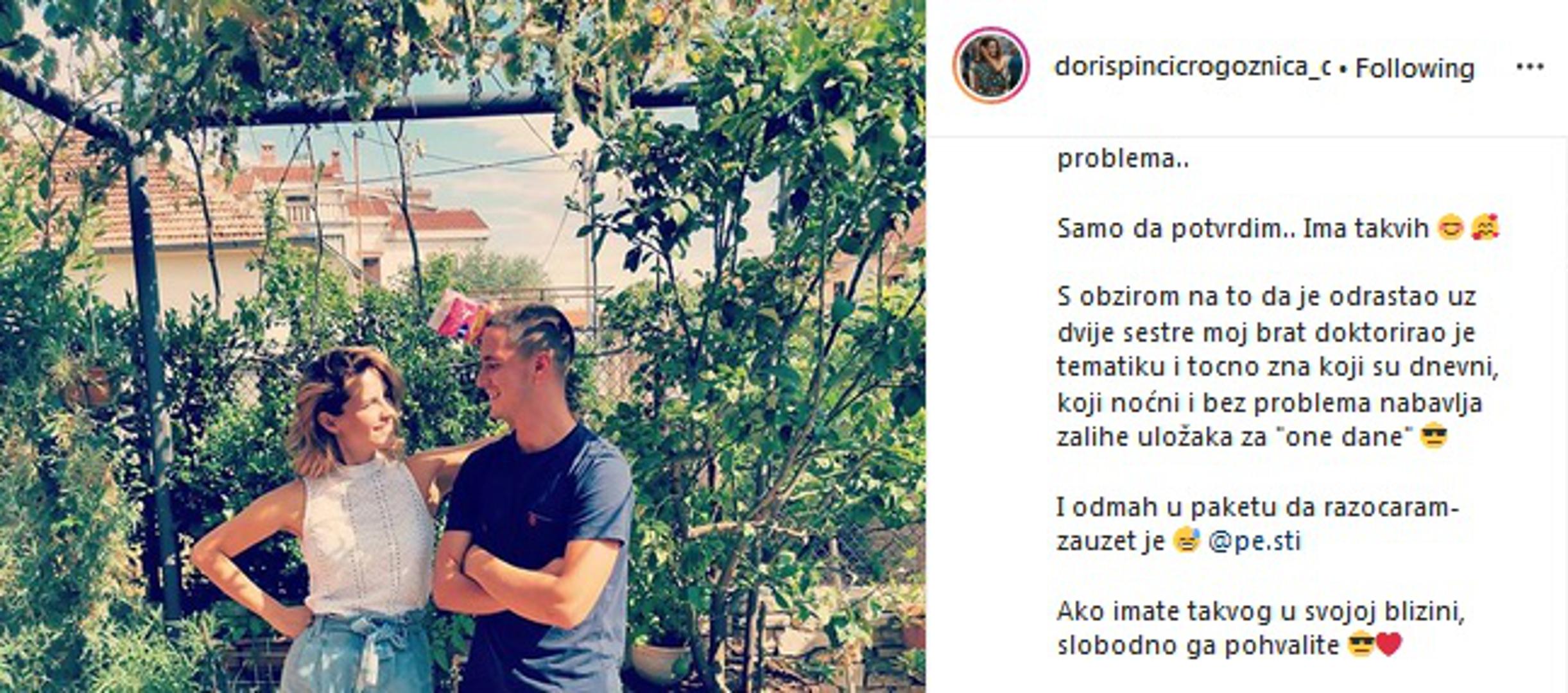 "Frajeri koji kupuju uloške bez problema... Samo da potvrdim.. Ima takvih. S obzirom na to da je odrastao uz dvije sestre, moj brat doktorirao je tematiku i točno zna koji su dnevni, koji noćni i bez problema nabavlja zalihe uložaka za "one dane". I odmah u paketu da razočaram – zauzet je", napisala je Doris u opisu fotke s bratom. Ispod fotografije odmah se razvila rasprava o tome trebaju li muškarci ženama kupovati uloške ili ne.