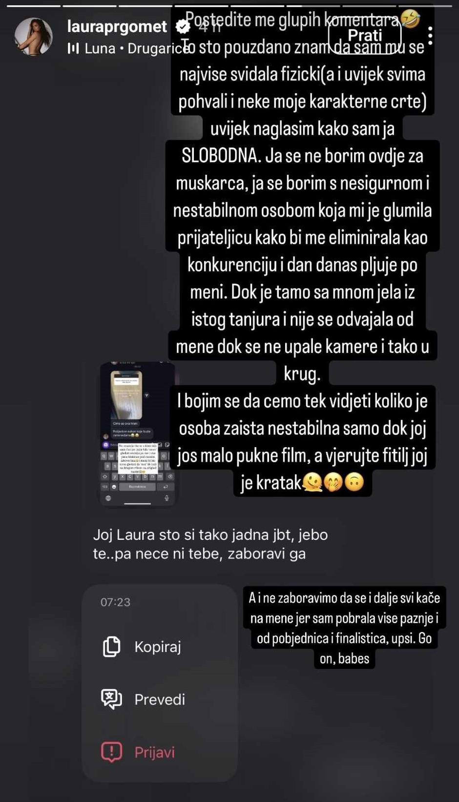Laura je dodatno zaoštrila retoriku, upozoravajući na Vanjinu navodnu prirodu: "I bojim se da ćemo tek vidjeti koliko je osoba zaista nestabilna, samo dok joj malo pukne film, a vjerujte, fitilj joj je kratak", nastavila je. Nije propustila ni sarkastično odgovoriti na Vanjin komentar o "korištenju aduta". "Adute... ajde tu me i pohvalila draga moja prijateljica! Ako treba instrukcije iz korištenja aduta na raspolaganju sam kad me odblokira", napisala je Laura, sugerirajući da ju je Vanja blokirala na društvenoj mreži. Na kraju, Laura je zaključila svoju objavu tvrdnjom da je upravo ona u centru pažnje, unatoč tome što nije pobijedila: "A ne zaboravimo da se i dalje svi kače na mene jer sam pobrala više pažnje i od pobjednice i finalistice, upsi. Go on, babes”, završila je.