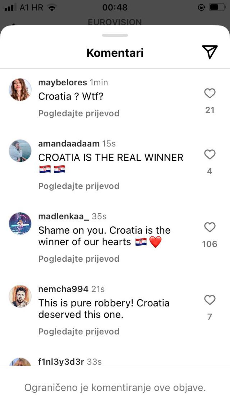 I ove godine publika diljem Europe i svijeta u velikom broju prati natjecanje. Večeras na društvenim mrežama komentiraju finalnu večer, a jedan od natjecatelja koji su izazvali najveće oduševljenje je naš predstavnik. Ovako su na službenoj Instagram stranici Eurovizije fanovi reagirali na drugo mjesto Baby Lasagne.