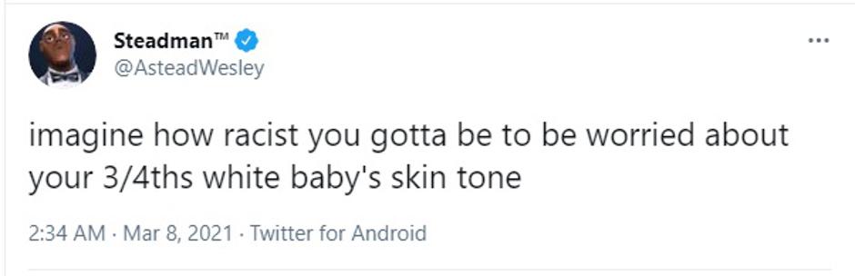 - Zamislite koliki rasist morate biti ako brinete o tonu kože bebe koja je tri četvrtine bijelac, napisao je jedan korisnik twittera.