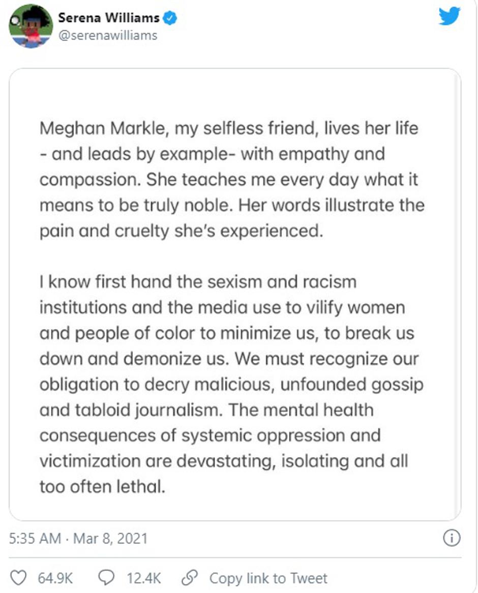 Nakon eksplozivnog intervjua u kojem su Harry i Meghan kod Oprah Winfrey kazali kako su se prijašnjih godina suočavali s brojnim problemima na britanskom dvoru, stižu i prve reakcije javnosti. Korisnici društvenih mreža većinom su stali na njihovu stranu, a jedna od prvih slavnih osoba koja je to napravila je tenisačica Serena Williams, inače Meghanina dugogodišnja prijateljica.
