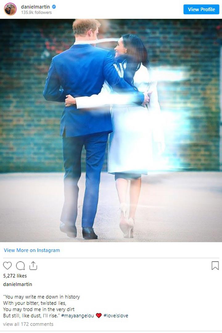 Daniel Martin, Meghanin šminker na dan njenog vjenčanja, podijelio je sliku para na Instagramu, zajedno s pjesmom Maye Angelou koja je rekla: "Možete me zapisati u povijest svojim gorkim, uvrnutim lažima, možete gaziti. Ja sam u prljavštini. Ali ipak ću se poput prašine podići. "
