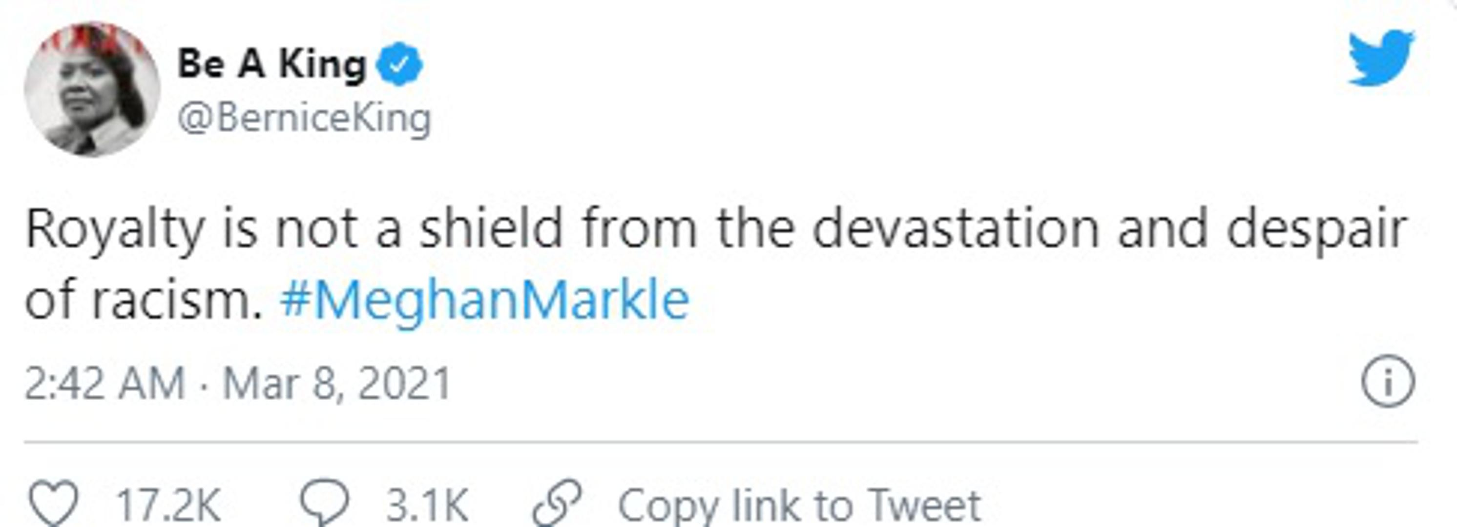 Bernice King, najmlađe dijete pokojnog aktivista za građanska prava Martina Luthera Kinga, tweetala je: "Kraljevstvo nije štit od razaranja i očaja. Zahvalna sam što je Meghan Markle još uvijek ovdje."