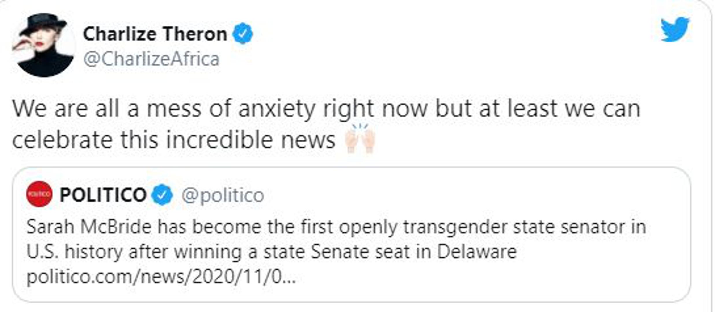 Javila se i slavna glumica Charlize Theron koja je potvrdila da je užasno anksiozna, ali je sretna što je Sarah McBride postala prva otvoreno transrodna državna senatorica.