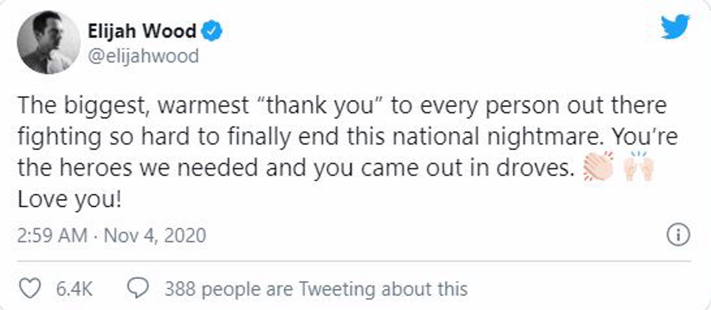Zvijezda "Gospodara prstenova" Elijah Wood napisao je kako je zahvalan svim osobama koje su izašle na izbore kako bi se završila "ova noćna mora".