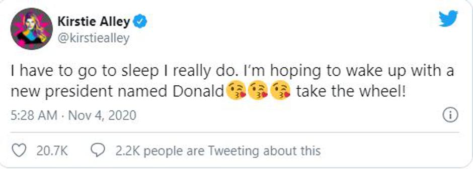 Glumica Kirstie Alley, jedna od malobrojnih slavnih fanova Trumpa, isto je bila budna cijelu noć.