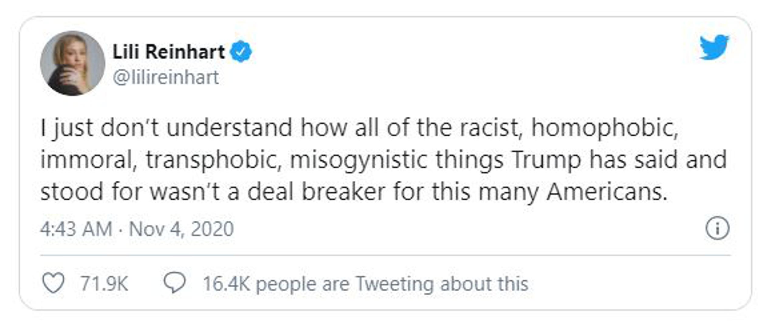 – Ne razumijem kako Amerikancima nije dosta Trumpa koji stoji iza svojih homofobnih, rasističkih i mizoginih izjava – napisala je.