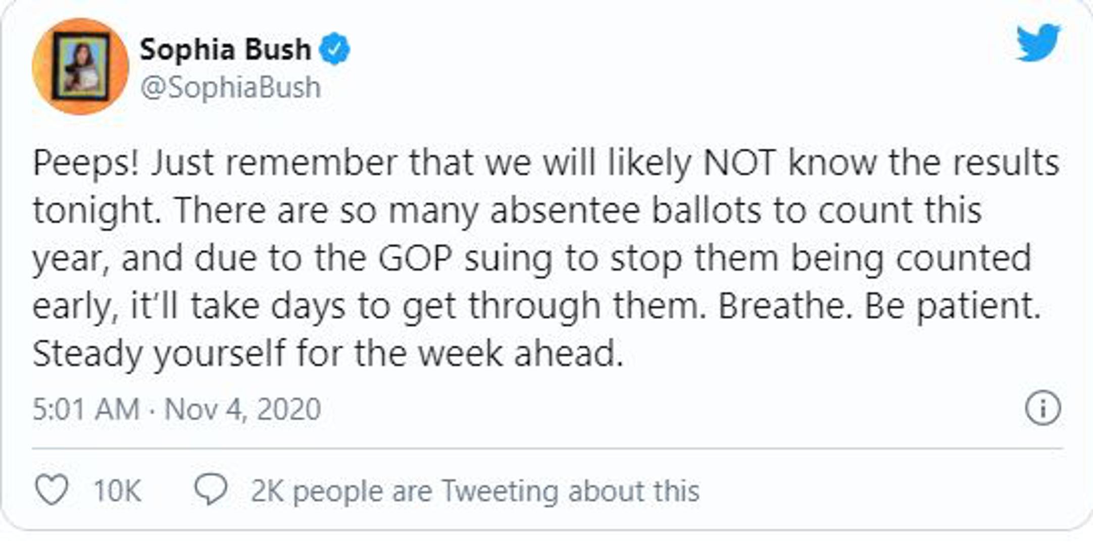 Mnoge zvijezde poput glumice Sophije Bush upozoravaju svoje pratitelje kako rezultati najvjerojatnije neće biti poznati danas te da ljudi trebaju biti smireni do kraja tjedna.