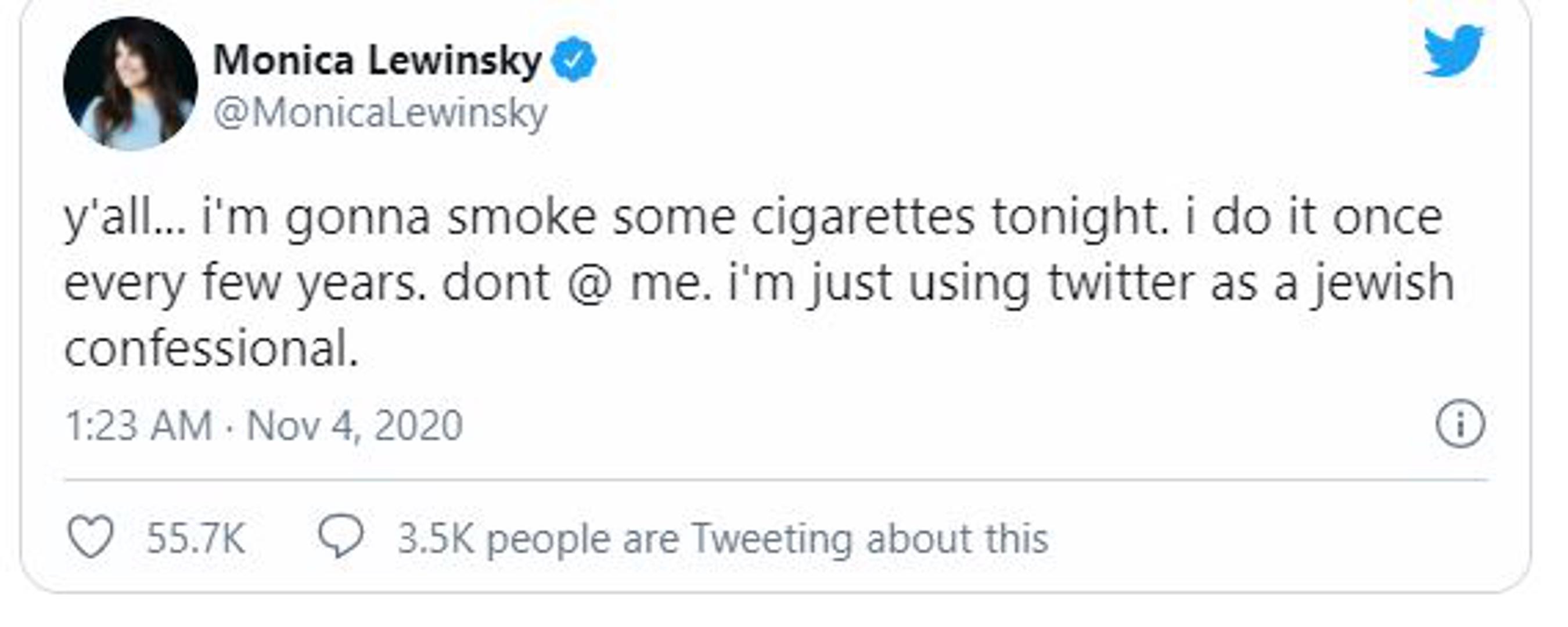 "Mislim da ću zapaliti nekoliko cigareta. Činim to svakih nekoliko godina. Nemojte me prozivati, koristim Twitter kao židovsku ispovjedaonicu", napisala je.