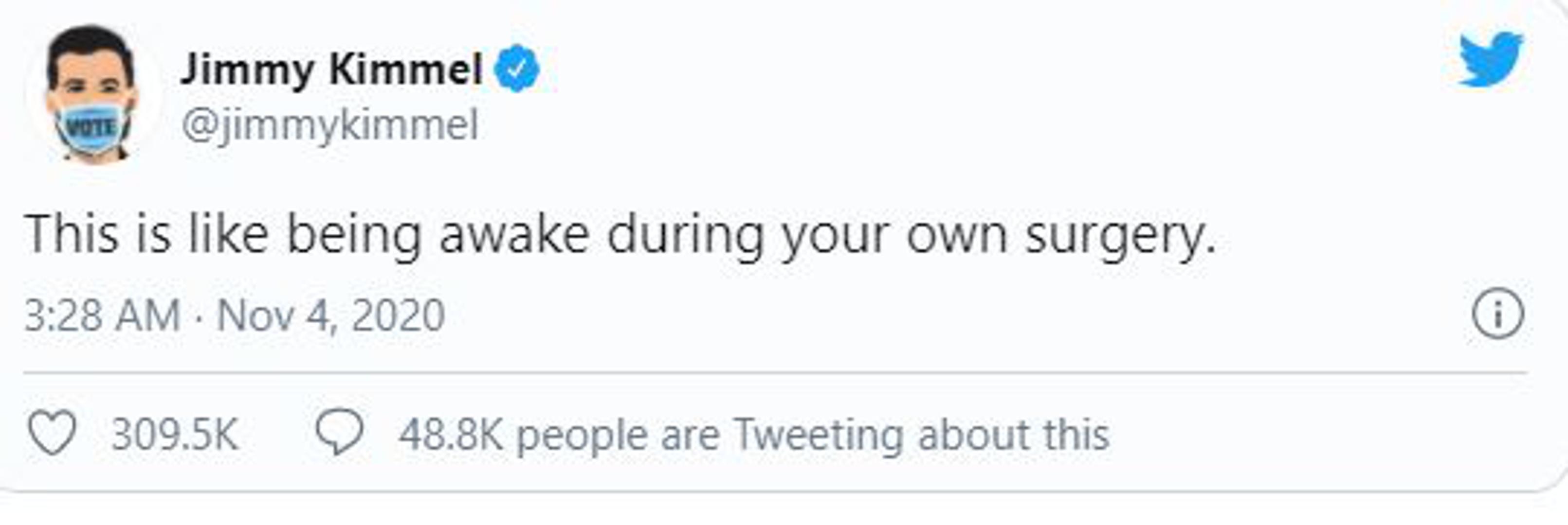 Komičar i voditelj Jimmy Kimmel kazao je da je biti budan na izbornu noć jednako kao da si budan za vrijeme vlastite operacije.