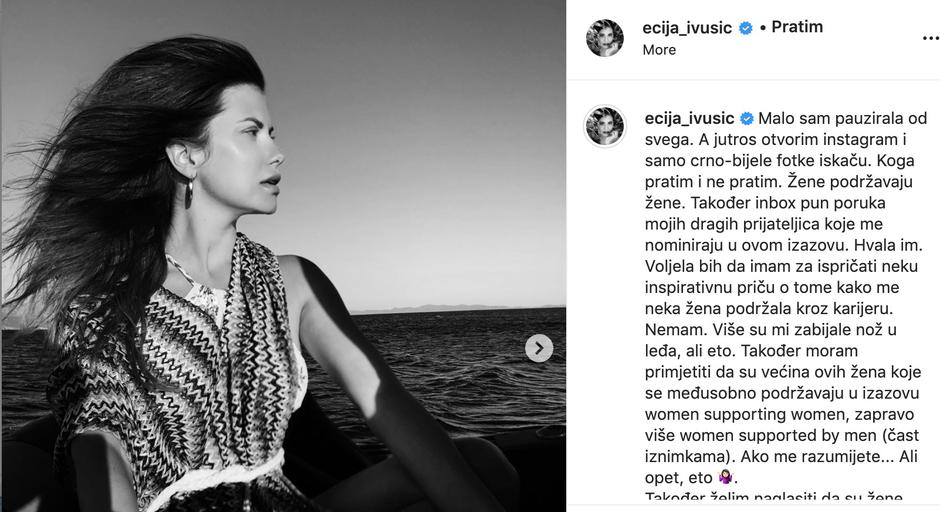 Brojne poznate Hrvatice pridružile su se globalnom izazovu #womansupportingwomen i na Instagramu su objavile svoje crno - bijele fotke uz poruke kojima žene u cijelom svijetu žele pokazati povezanost, te koliko je važno njihovo zajedničko djelovanje. U svoj inbox poziv da sudjeluje u ovom izazovu dobila je i voditeljica Ecija Ivušić i zahvalila se svima koji su je pozvali da u izazovu sudjeluje i napisala je svoje viđenje cijelog tog izazova.
