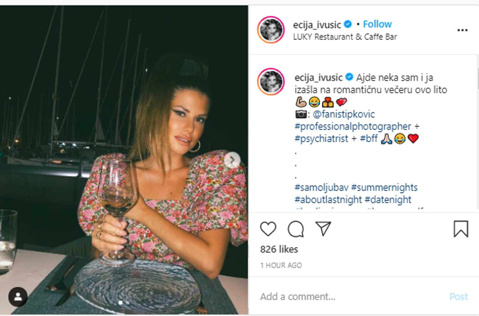 - Ajde neka sam i ja izašla na romantičnu večeru ovo lito - napisala je Ecija ispod fotografije na kojoj je označila kolegicu novinarku i manekenku Fani Stipković.