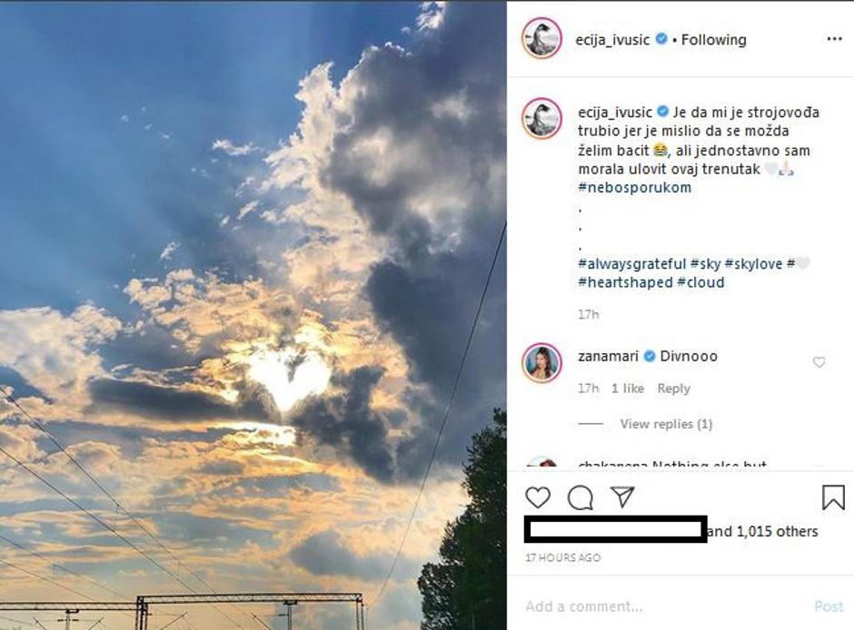 Bivša voditeljica Ecija Ivušić svoje pratitelje na društvenim mrežama često časti svojim izazovnim fotografijama, no ovog se puta dogodio preokret. Ecija je naime obožavatelje razveselila prizorom na nebu koji je snimila na jednoj pruzi u Zagrebu. Zrake sunca među oblacima napravile su oblik srca, a ovaj nesvakidašnji prizor Ecija je odlučila ovjekovječiti.