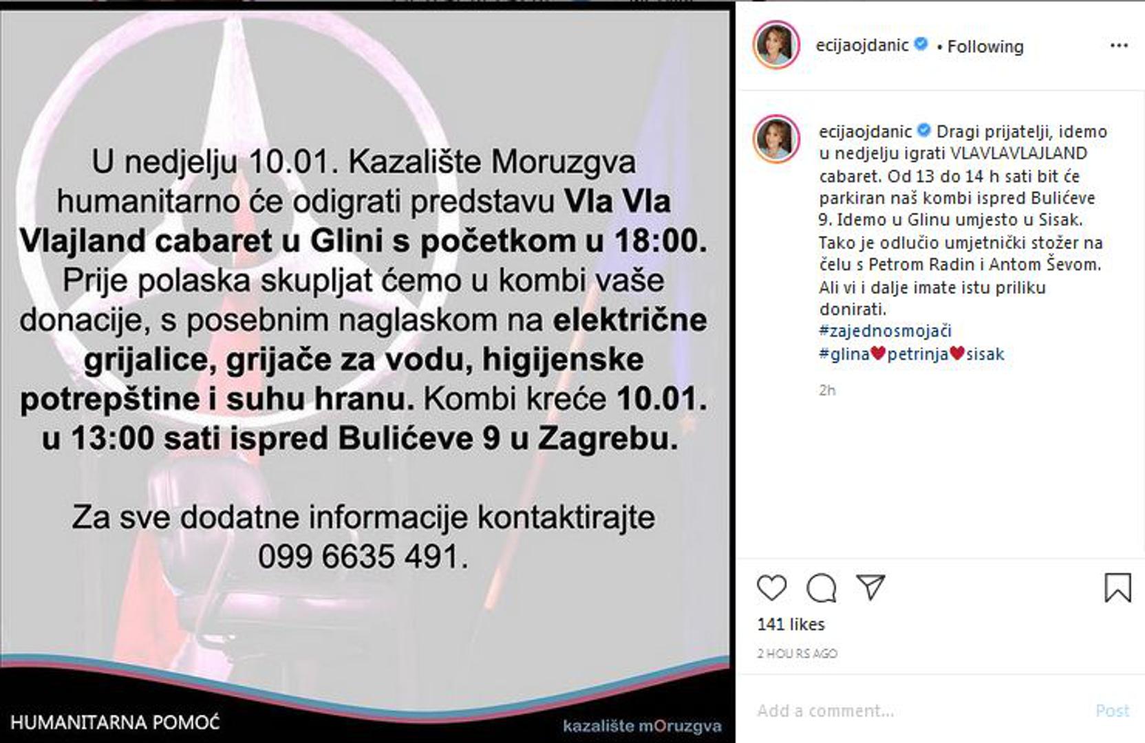 - Dragi prijatelji, idemo u nedjelju igrati VLAVLAVLAJLAND cabaret. Od 13 do 14 h sati bit će parkiran naš kombi ispred Bulićeve 9. Idemo u Glinu umjesto u Sisak. Tako je odlučio umjetnički stožer na čelu s Petrom Radin i Antom Ševom. Ali vi i dalje imate istu priliku donirati - poručila je glumica putem svog Instagrama uz hešteg #Zajednosmojači.
