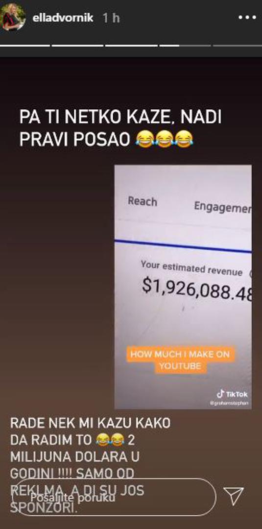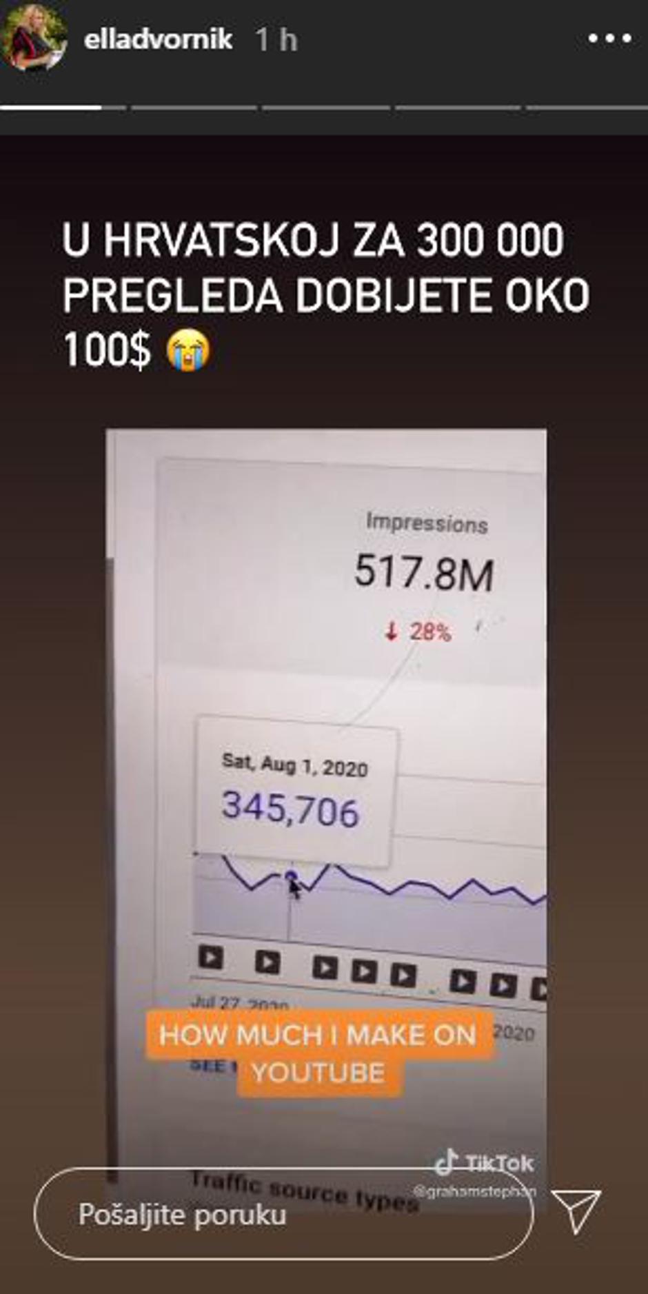 Ella Dvornik s pratiteljima je podijelila video Amerikanca koji na Tik Toku pokazuje koliko zarađuje od YouTubea u SAD-u. Potom je usporedila sa zaradom od istih pregleda u Hrvatskoj i dala svoj komentar.