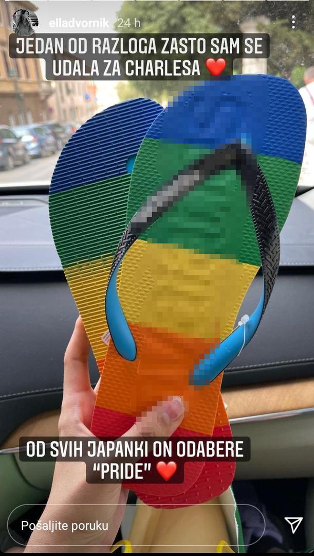 Na fotografiji se nalazi par japanki koje na sebi imaju neke dugine boje te njezino priznanje. "Jedan od razloga zašto sam se udala za Charlesa", napisala je influencerica iznad japanki te stavila srčeko. Pojašnjenje je uslijedilo ispod japanki. "Od svih japanki, on odabere 'pride'", pojasnila je i opet dodala srčeko.