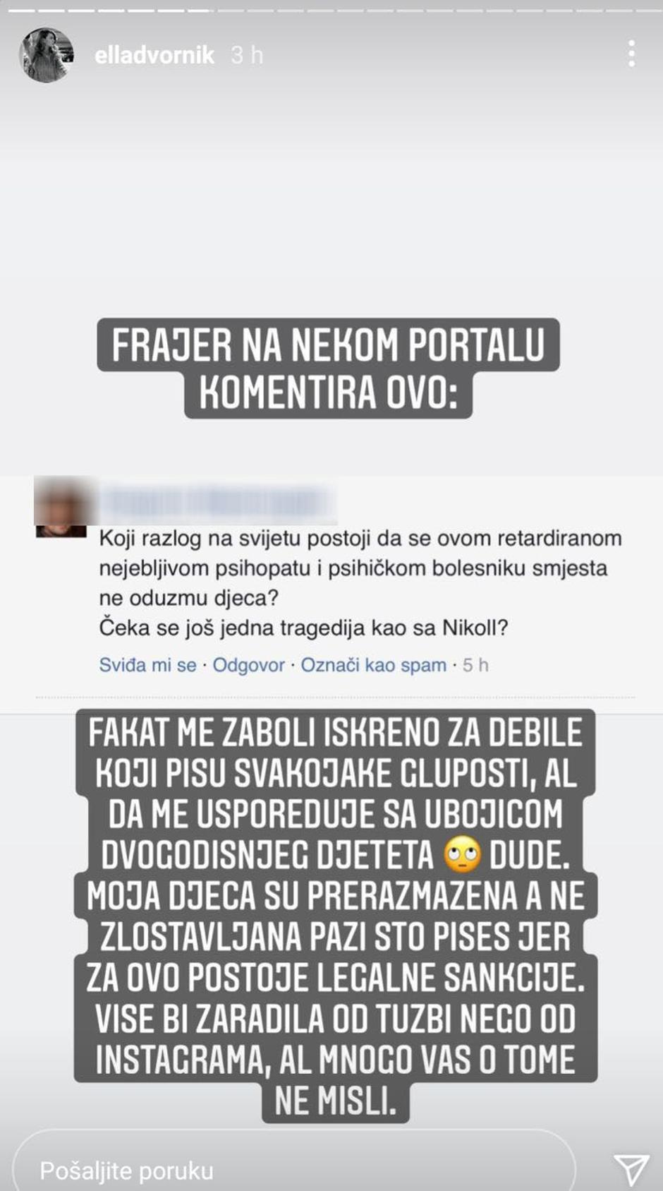 Influencerica i blogerica Ella Dvornik često je na meti negativnih komentara na koje se često ne osvrće. No, ovog ju je puta jedan komentar vezan uz njezinu djecu toliko razbjesnio da ga je objavila na svom Insta Storyju.
