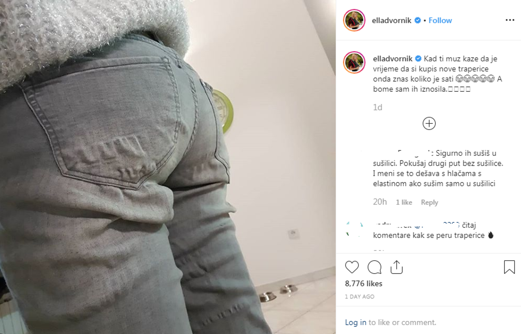 Blogerica Ella Dvornik našalila se na Instagramu te objavila fotografiju na kojoj se vidi njezina stražnjica u starim, ispranim trapericama.