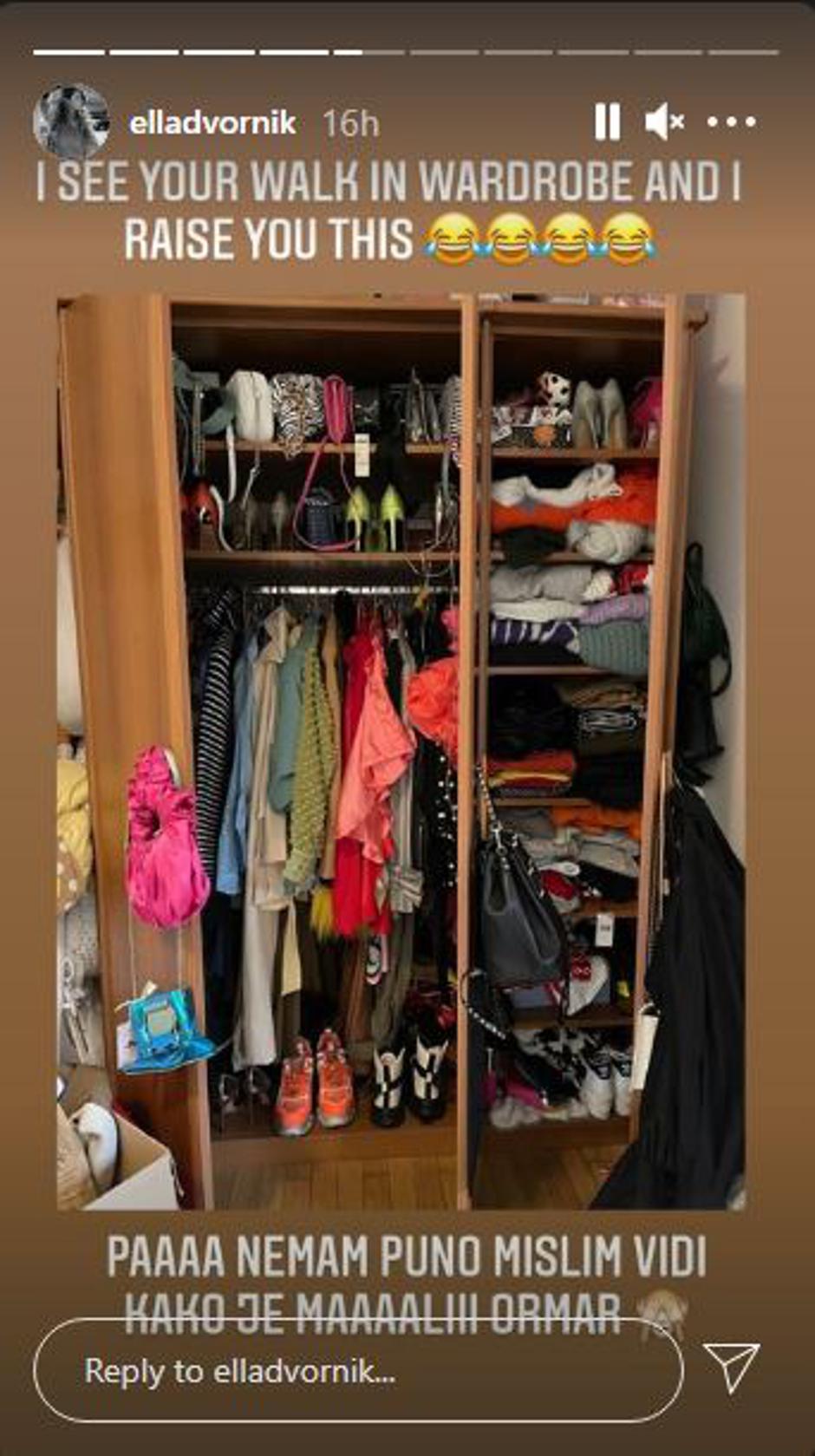 "Pa nema puno, mislim vidi kako je malen ormar", napisala je na fotografiji Ella, a u storyju prije dala je i zanimljiv savjet za one kojima se ne da spremati odjeća: "Za ljenčuge poput mene - ako vam se ne da odmah sve staviti na mjesto, igrajte igru koja se zove 'Svaki put kada prođem pokraj sobe spremit ću nešto'. I do kraja dana sve će biti u ormaru", kazala je.