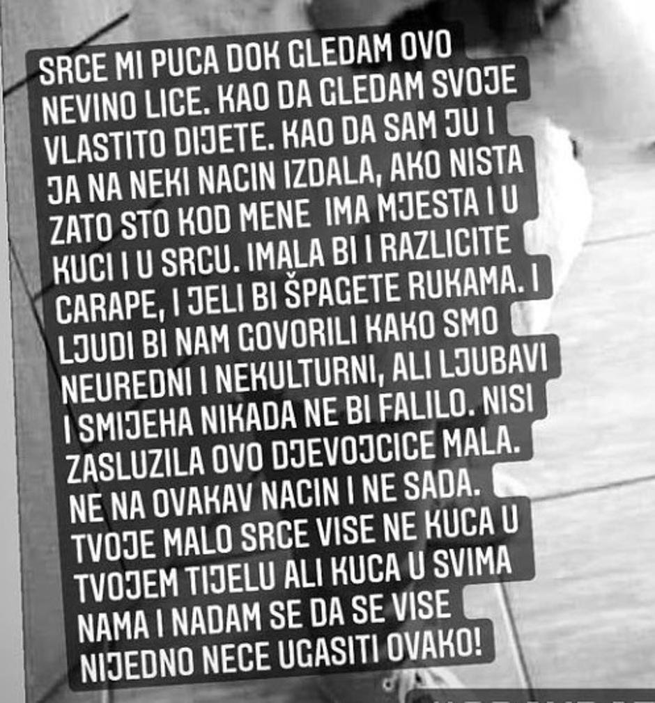 "Srce mi puca dok gledam ovo nevino lice. Kao da gledam svoje vlastito dijete. Kao da sam je i ja na neki način izdala, ako ništa zato što kod mene ima mjesta i u kući i u srcu", napisala je Ella.