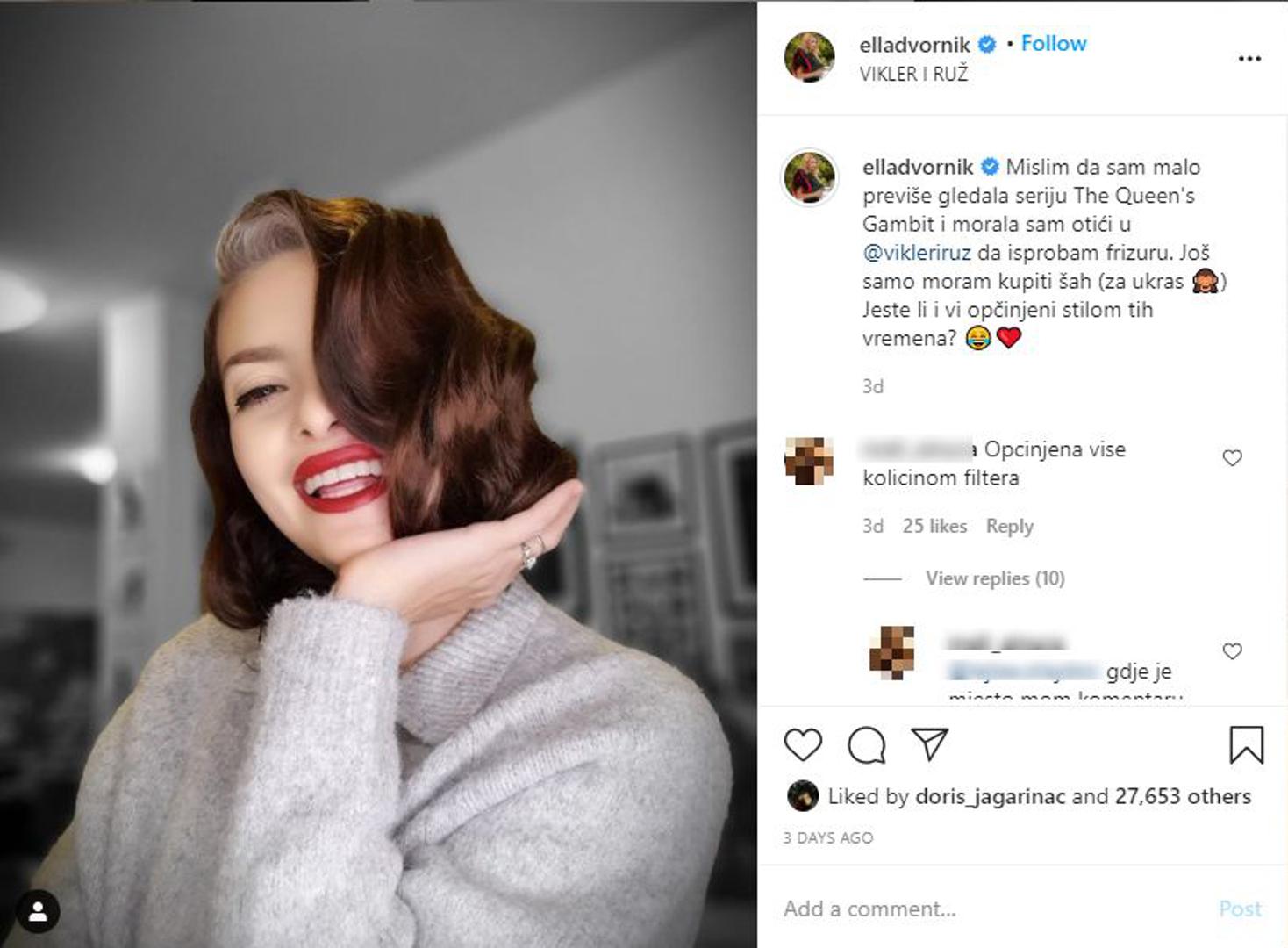 - Mislim da sam malo previše gledala seriju The Queen's Gambit i morala sam otići u frizerski salon da isprobam frizuru. Još samo moram kupiti šah (za ukras) Jeste li i vi opčinjeni stilom tih vremena? - upitala je fanove Ella i pohvalila se novim izgledom. Fotografija je prikupila oko 28 tisuća lajkova, komplimenti su se redali, ali jedna pratiteljica uputila joj je ciničnu kritiku.