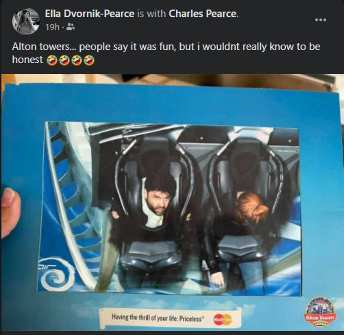 Influencerica Ella Dvornik na društvenim je mrežđama objavila fotografiju iz vremena kada su on i njezin suprug Charles tek bili na početku veze. Ella i Charles išli su u zabavni park Alton Towers u Engleskoj, te su ih tamo slikali nakon vožnje vlakom smrti. Ella je na fotografiji pognula glavu, ali Charlesu se vidi lice, te mnogi fanovi pišu kako ne nalikuje na sebe.
