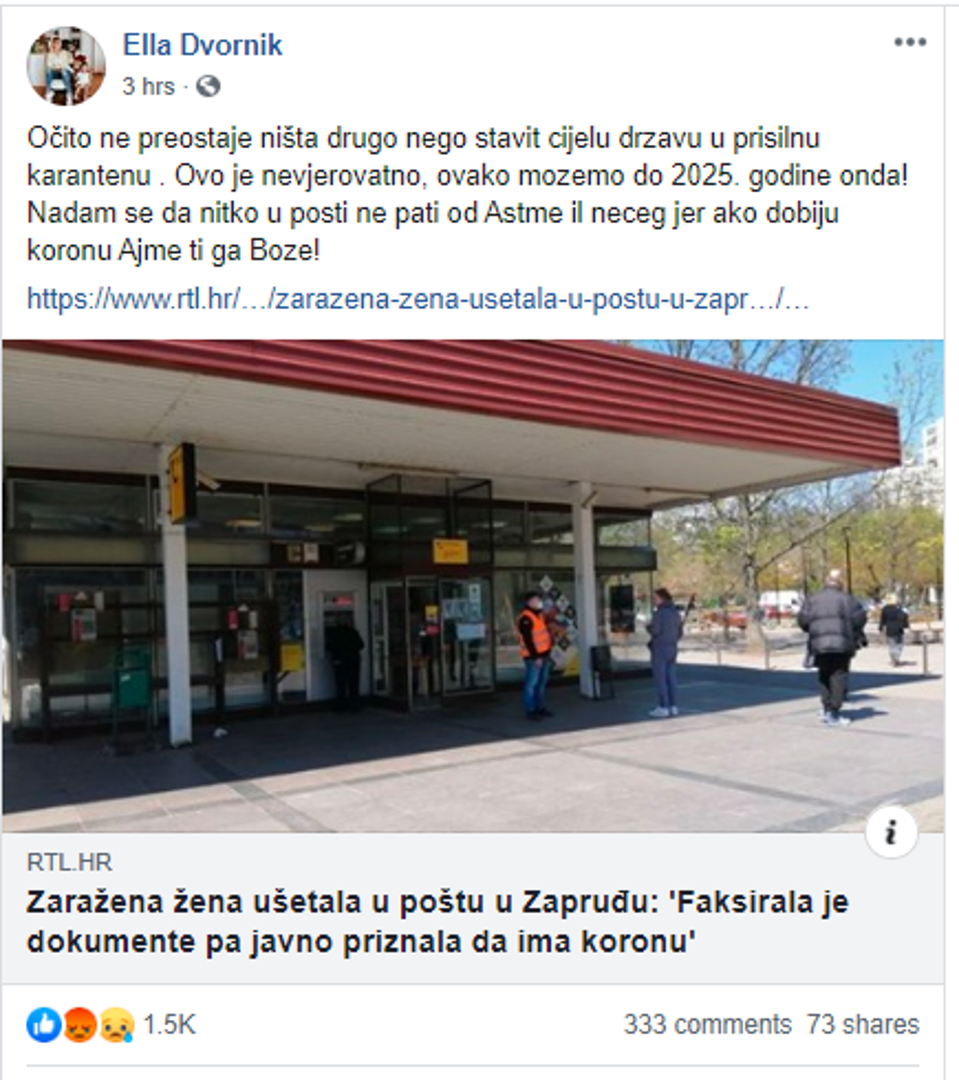 "Očito ne preostaje ništa drugo nego staviti cijelu državu u prisilnu karantenu. Ovo je nevjerovano, ovako možemo do 2025. godine onda! Nadam se da nitko u pošti ne pati od astme il nečeg jer ako dobiju koronu, ajme ti ga Bože", napisala je, a ispod njezine objave razvila se rasprava.