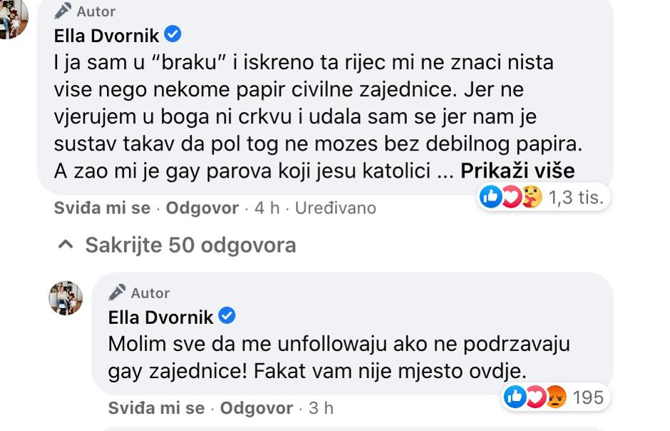 Papa Franjo izjavio je kako homoseksualci imaju pravo biti obitelj i rekao je da su i oni Božja djeca i imaju pravo na obitelj, a članak s ovom izjavom na svom Facebooku prenijela je i blogerica i influencerica Ella Dvornik.  - Počinjem vjerovati u čuda - napisala je Ella i u komentaru ispod objave je dodala: