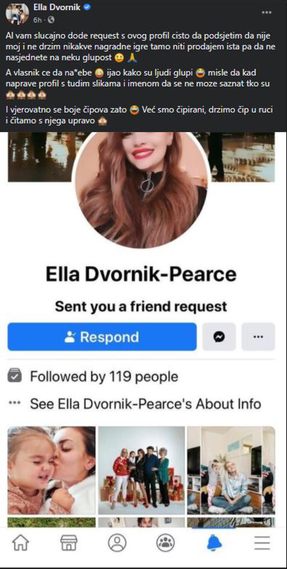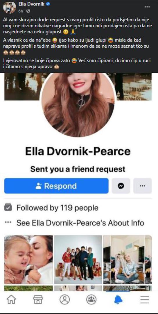 "Ako vam slučajno dođe request s ovog profila čisto da podsjetim da nije moj i ne držim nikakve nagradne igre tamo niti prodajem išta pa da ne nasjednete na neku glupost. A vlasnik će da na*ebe. Ijao kako su ljudi glupi, misle da kad naprave profil s tuđim slikama i imenom da se ne može saznati tko su. I vjerojatno se boje čipova zato. Već smo čipirani, držimo čip u ruci i čitamo s njega upravo" napisala je Ella uz objavu. Dodala je i iskustvo pratiteljice, te uz objavu napisala da je sve prijavila.