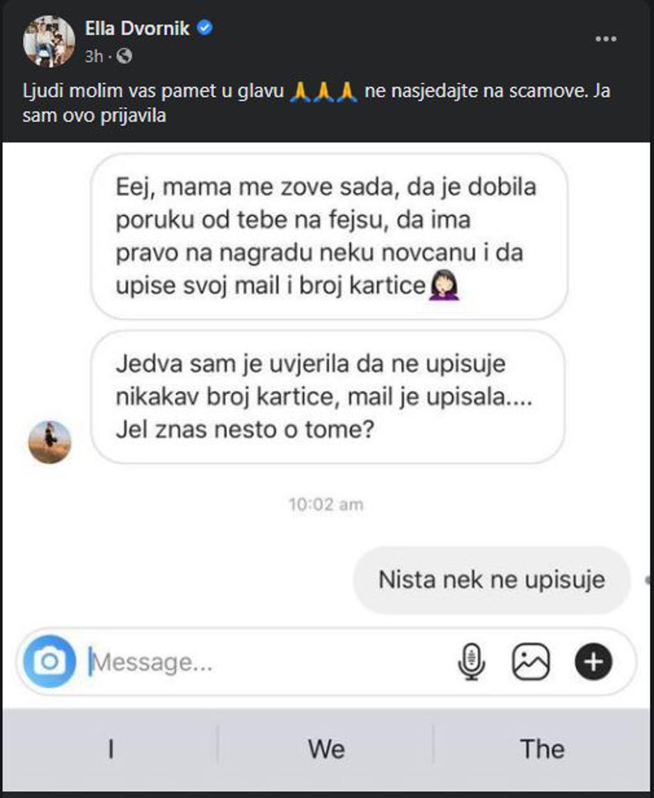 Influencerica Ella Dvornik posljednja je u nizu javnih osoba koje su postale žrtve krađe identiteta. Drski prevarant ukrao je brojne privatne Elline fotografije s njezinih profila i dodavao njezine obožavatelje te im u privatne poruke na društvenim mrežama pisao da su osvojile nagradu u igri kako bi dobio njihove osobne informacije. Ella je podijelila i iskustvo jedne pratiteljice čija majka je zamalo nasjela na prijevaru.