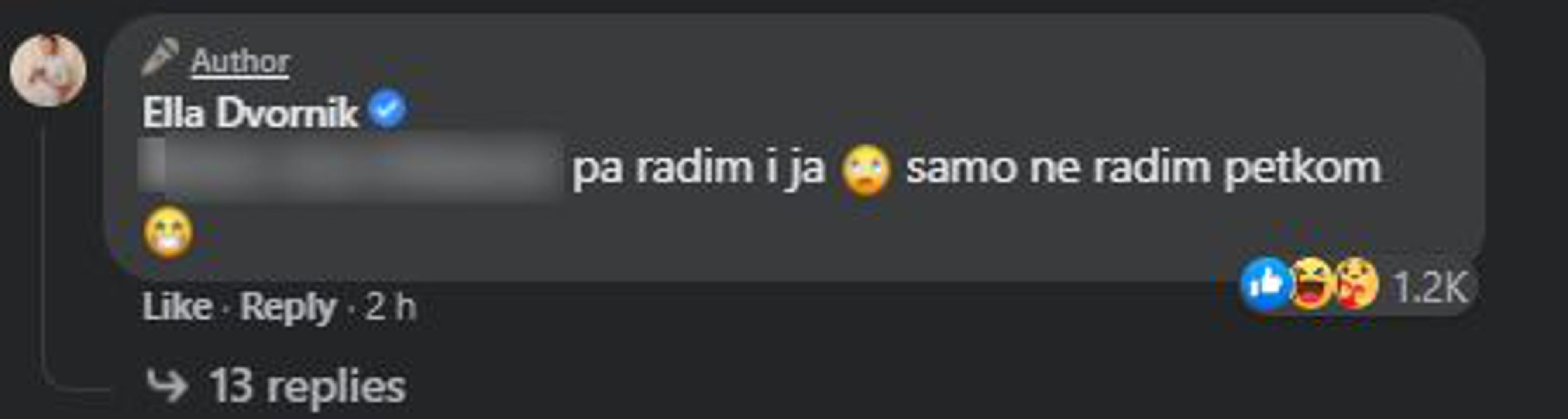- Radim i ja, samo ne petkom, odgovorila joj je Ella. a njeni pratitelji su nakon toga počeli raspravljati idu li Ellina djeca u gradski vrtić ili privatni, no ona im nije odgovorila.
