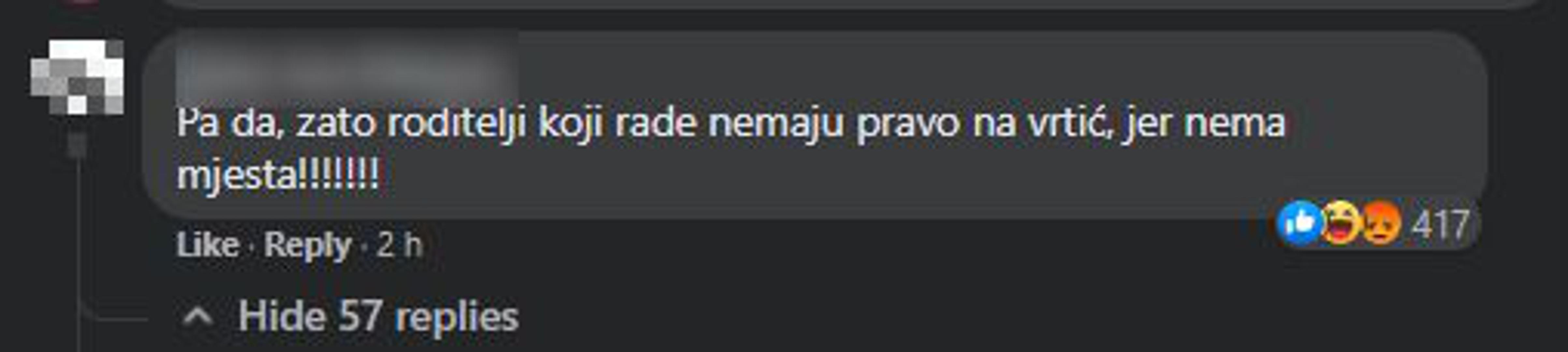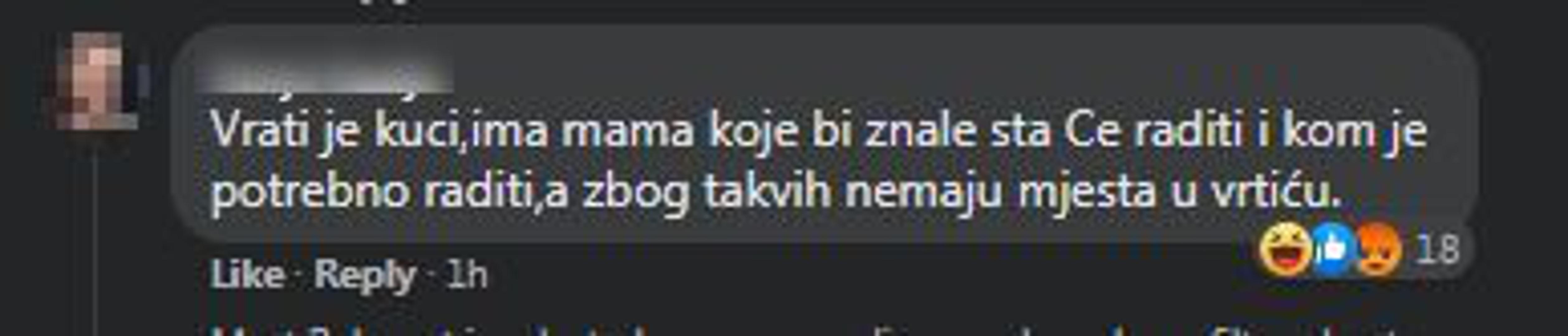 - Pa da, zato roditelji koji rade nemaju pravo na vrtić, jer nema mjesta, napisala joj je jedna gospođa,, a druga je dodala "vrati je kući, ima mama koje bi znale što će raditii kom je potrebno raditi, a zbog takvih nema mjesta u vrtiću".