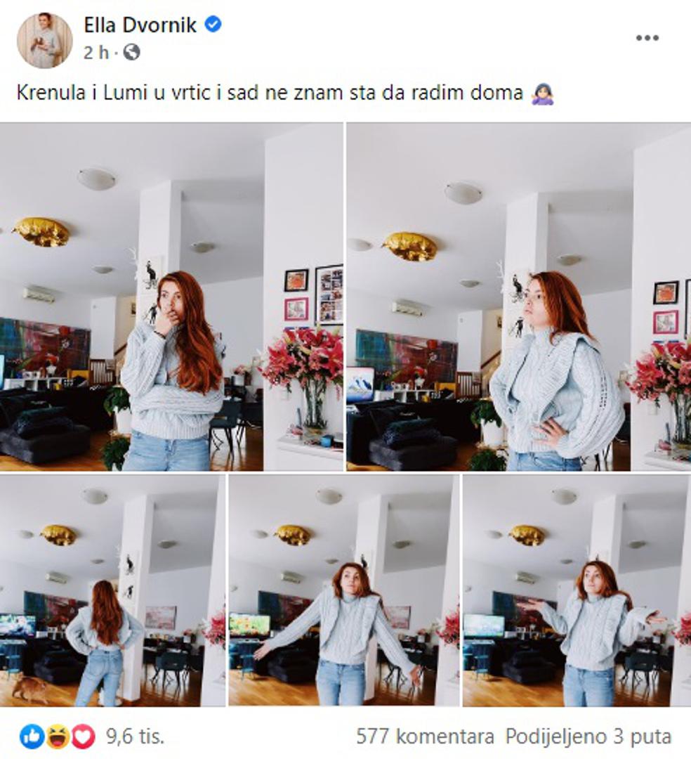 Ella Dvornik objavila je na Instagramu kako je njena mlađa kći Lumi krenula u vrtić. Objavila je nekoliko fotografija na kojima se vidi kako je sama u stanu i napaisala je: "Krenula i Lumi u vrtić i sad ne znam šta da radim doma".