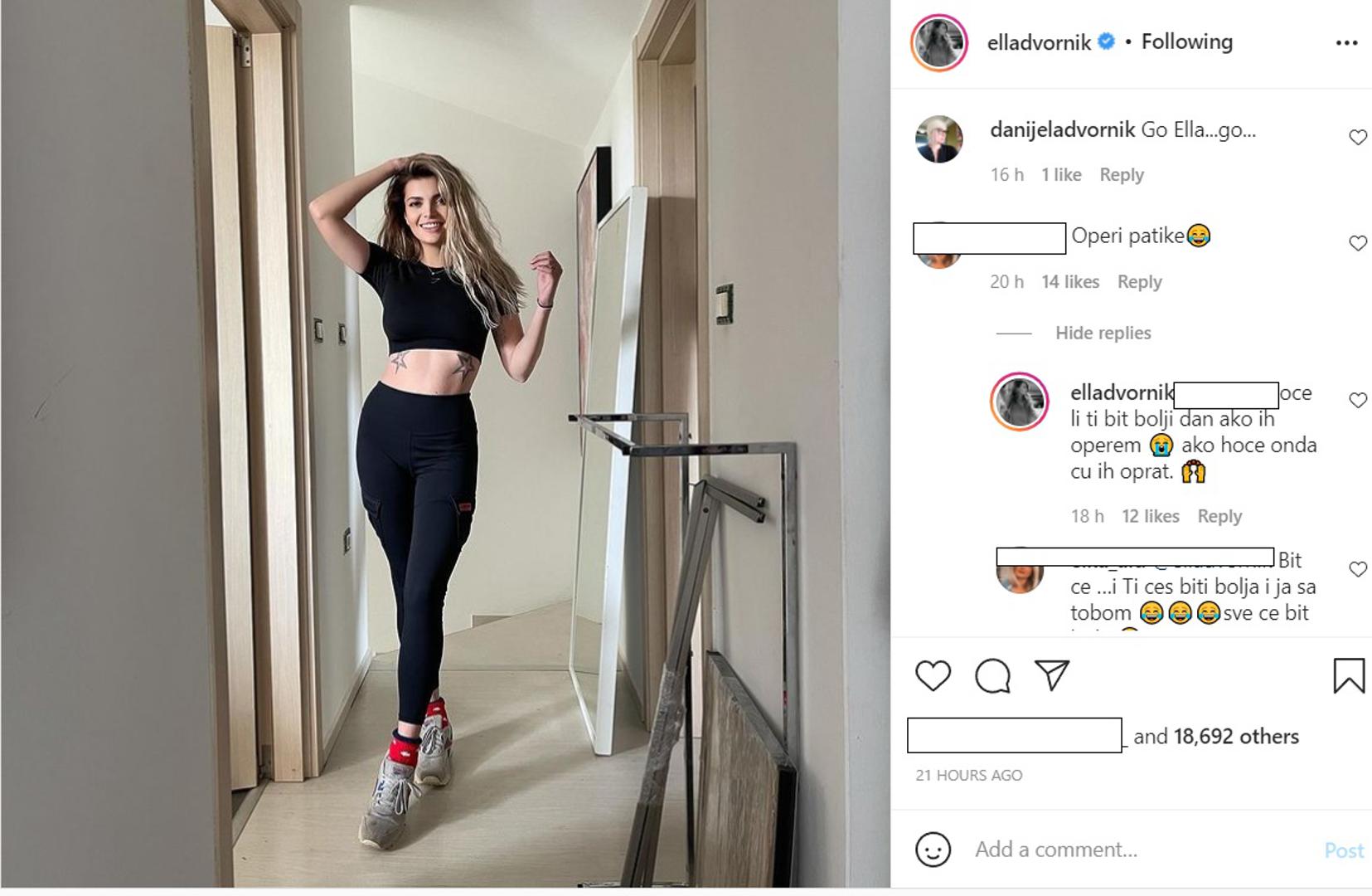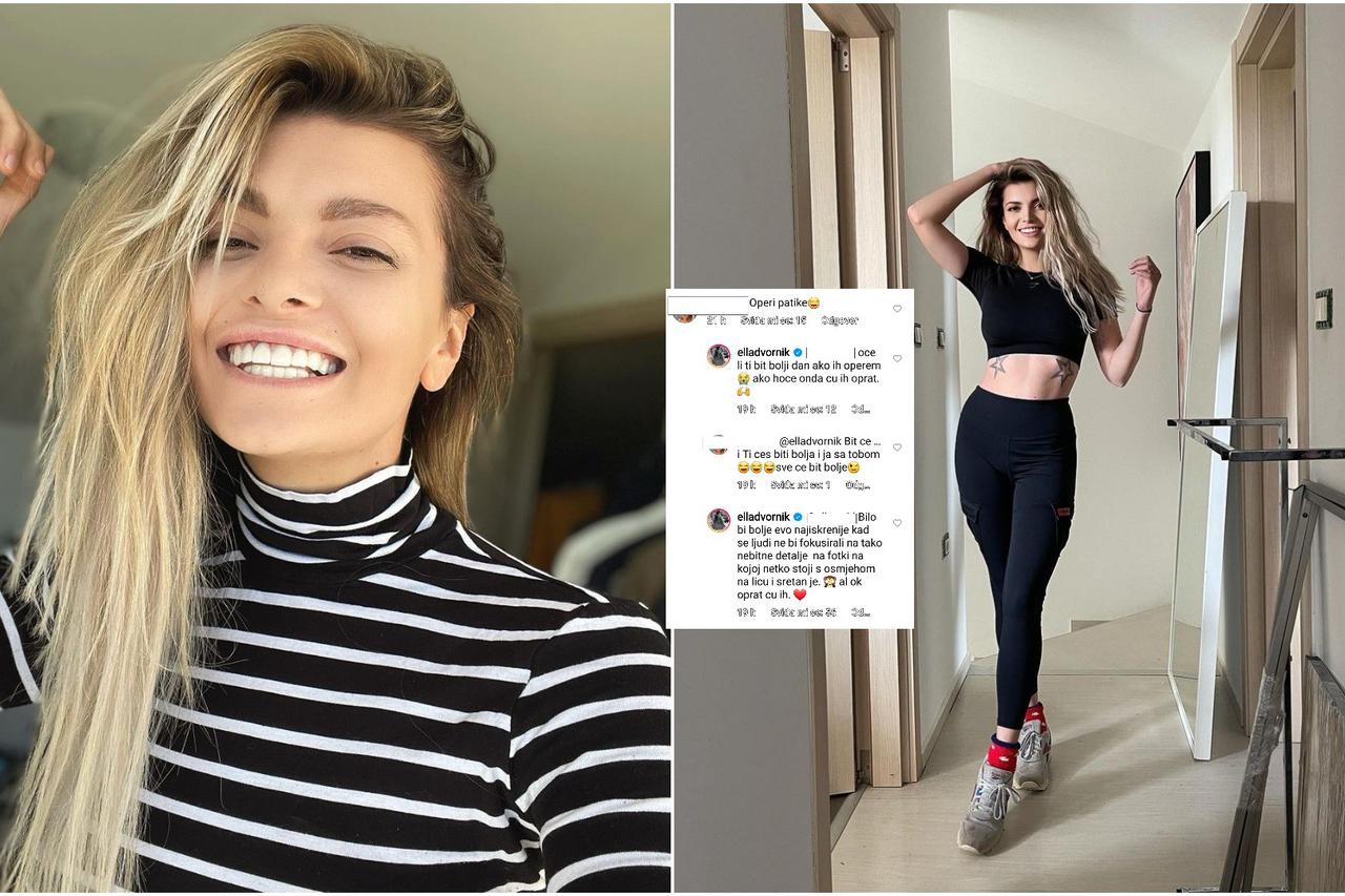 "Operi tenisice", poručila joj je zgrožena pratiteljica, a ubrzo se javila i Ella koja joj je odmah odbrusila. "Hoće li ti bit' bolji dan ako ih operem 😭 ako hoće, onda ću ih oprati. 🙌", uzvratila je Ella.