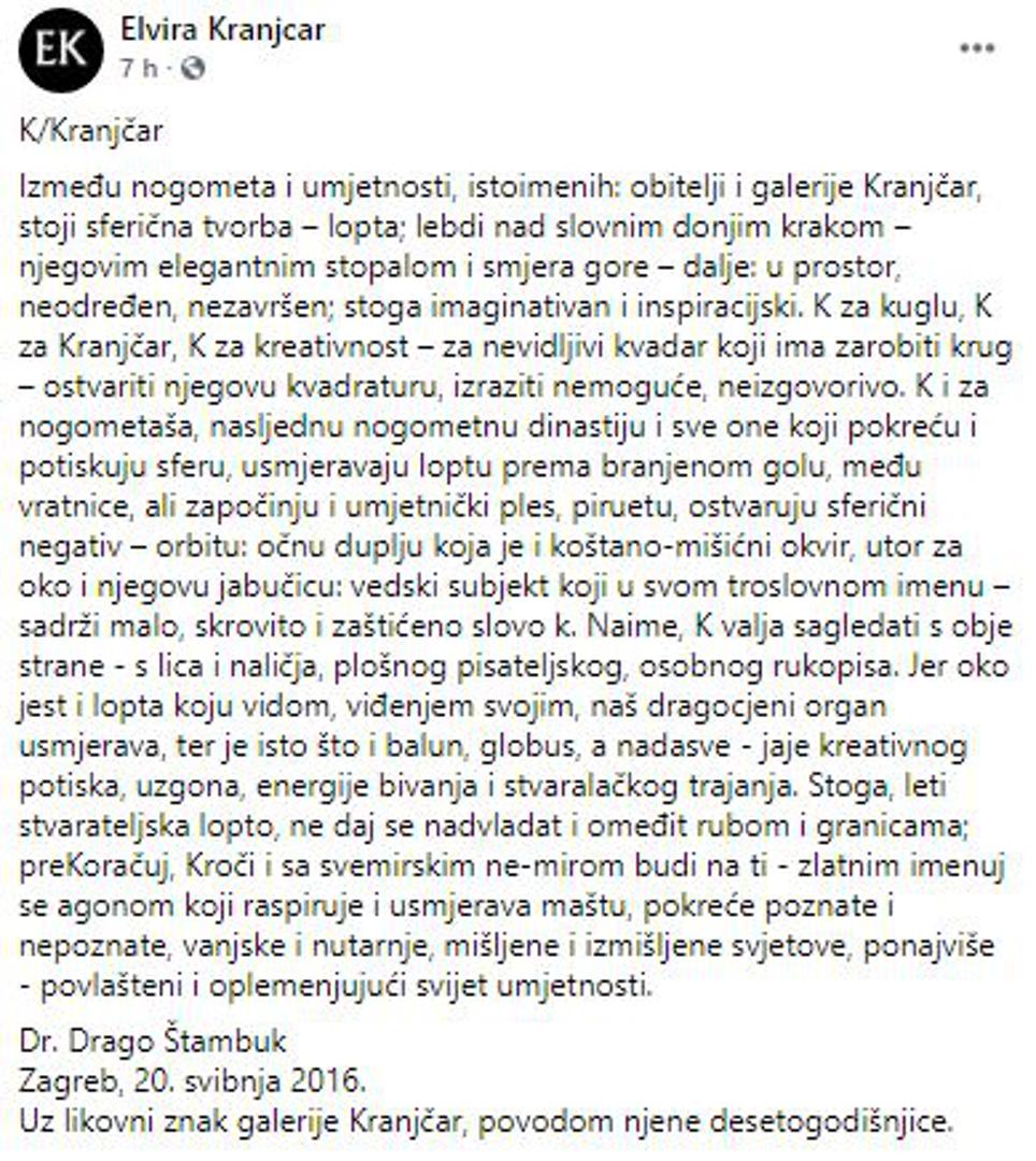 - Između nogometa i umjetnosti, istoimenih: obitelji i galerije Kranjčar, stoji sferična tvorba – lopta; lebdi nad slovnim donjim krakom – njegovim elegantnim stopalom i smjera gore – dalje: u prostor, neodređen, nezavršen; stoga imaginativan i inspiracijski. K za kuglu, K za Kranjčar, K za kreativnost – za nevidljivi kvadar koji ima zarobiti krug – ostvariti njegovu kvadraturu, izraziti nemoguće, neizgovorivo. K i za nogometaša, nasljednu nogometnu dinastiju i sve one koji pokreću i potiskuju sferu, usmjeravaju loptu prema branjenom golu, među vratnice, ali započinju i umjetnički ples, piruetu, ostvaruju sferični negativ – orbitu: očnu duplju koja je i koštano-mišićni okvir, utor za oko i njegovu jabučicu: vedski subjekt koji u svom troslovnom imenu – sadrži malo, skrovito i zaštićeno slovo k. Naime, K valja sagledati s obje strane - s lica i naličja, plošnog pisateljskog, osobnog rukopisa. Jer oko jest i lopta koju vidom, viđenjem svojim, naš dragocjeni organ usmjerava, ter je isto što i balun, globus, a nadasve - jaje kreativnog potiska, uzgona, energije bivanja i stvaralačkog trajanja. Stoga, leti stvarateljska lopto, ne daj se nadvladat i omeđit rubom i granicama; preKoračuj, Kroči i sa svemirskim ne-mirom budi na ti - zlatnim imenuj se agonom koji raspiruje i usmjerava maštu, pokreće poznate i nepoznate, vanjske i nutarnje, mišljene i izmišljene svjetove, ponajviše - povlašteni i oplemenjujući svijet umjetnosti - napisala je Elvira uz fotografiju.
