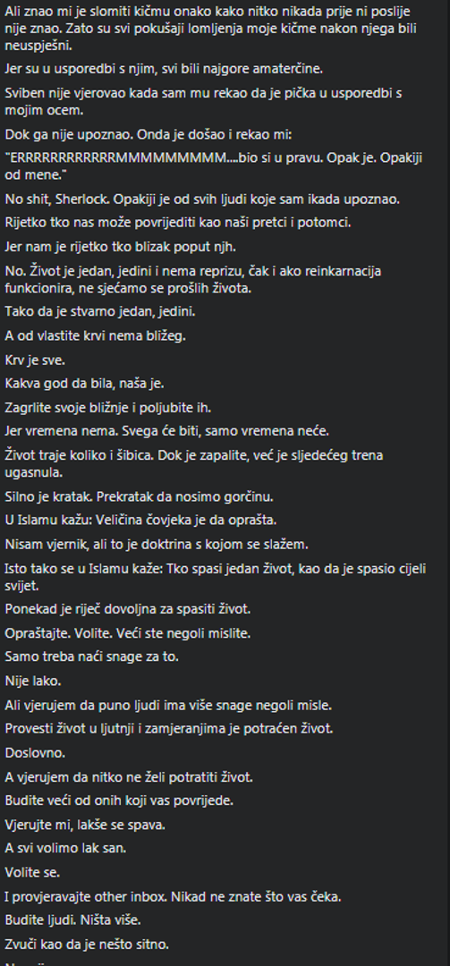- Otvorim poruku. Jedan gospodin mi se ispričava, da mu je jako žao što je negdje u nekom komentaru pisao nekakve gadosti na moj račun. Odgovorim mu da nisam niti vidio taj komentar, ali i da jesam, da nema veze, da je isprika uvažena, sve pet. Javlja se čovjek. Da mu je užasno žao, da nije razmišljao dok je pisao, da ga se sin odrekao i ne želi čuti za njega zbog toga što mi je pisao - nastavlja Ugljen koji dalje piše da je u daljnjem razgovoru s gospodinom saznao da se njegov sin naljutio na njega kad je vidio što je napisao i da mu je jako žao i neugodno i da se samo želi izmiriti sa svojim sinom na što mu je Asim rekao da je sve u redu i da može reći sinu kako mu ništa ne zamjera.