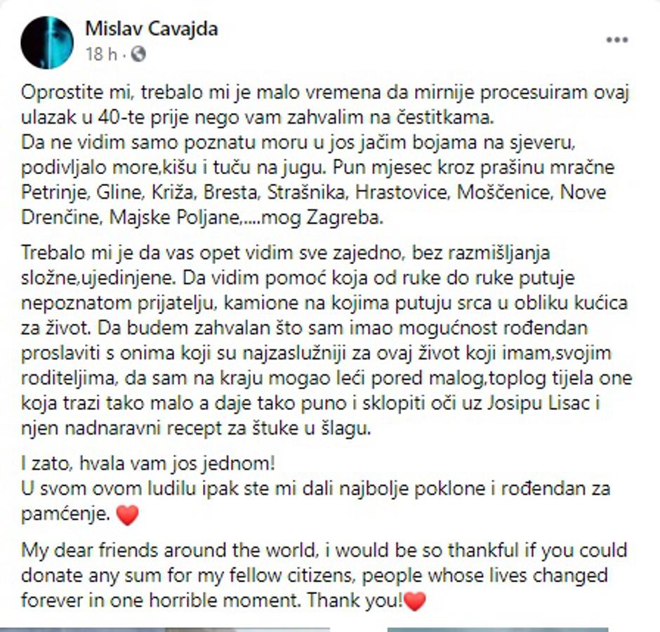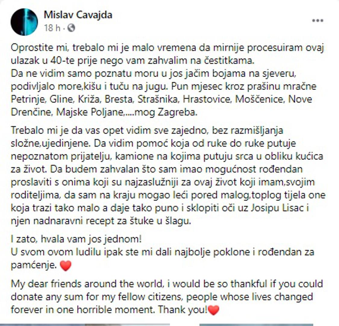 Glumac Mislav Čavajda dan prije katastrofalnog potresa koji je pogodio Petrinju, Glinu i Sisak proslavio je 40. rođendan, a jučer je u emotivnoj objavi na Facebooku zahvalio svima i kazao kako se osjeća.