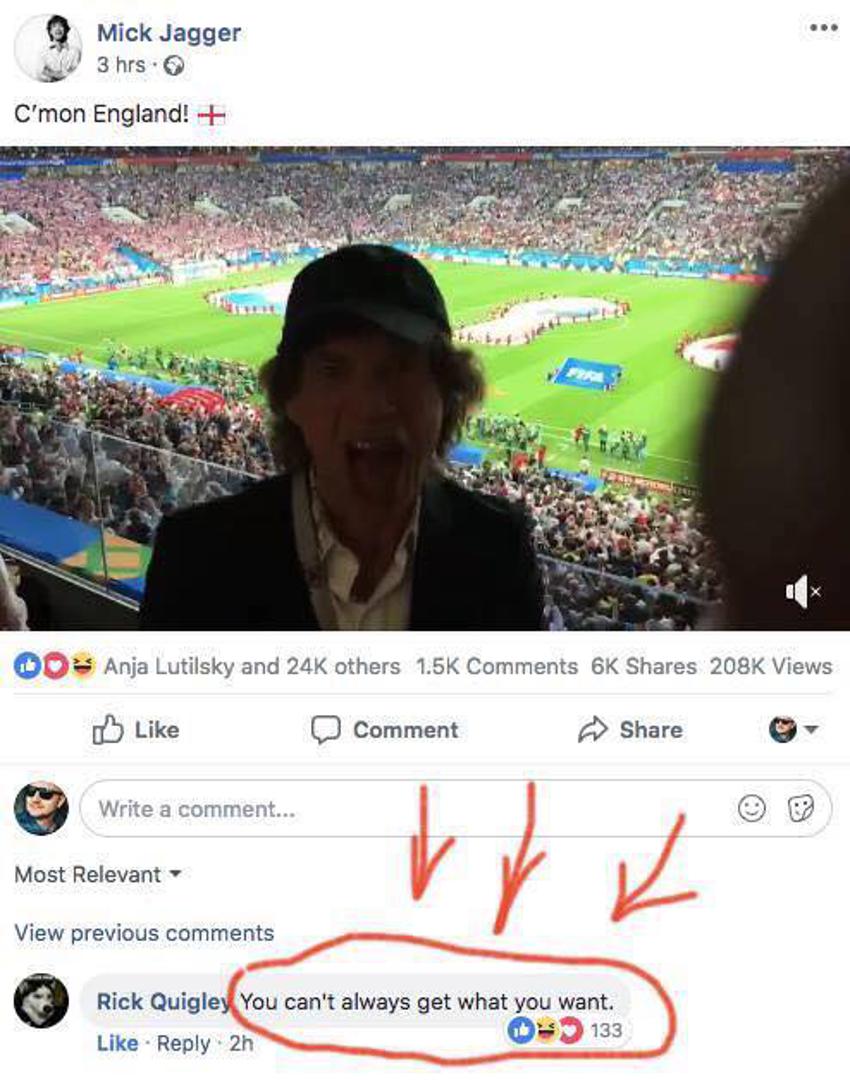 Sudeći po engleskim medijima, jedan je od najvećih krivaca za sinoćnji poraz njihove reprezentacije Mick Jagger. Frontmen Rolling Stonesa sinoć je bio na utakmici u Moskvi i objavio video sa stadiona uz poruku: "Idemo, Engleska!"