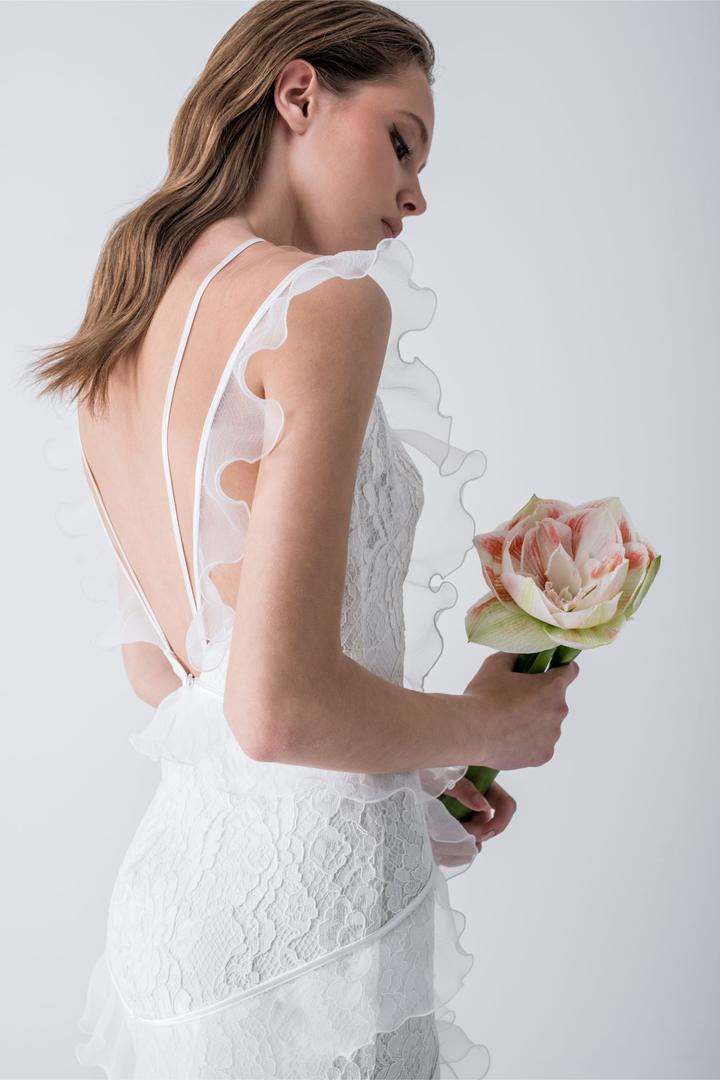 I ovoga su puta vjenčane kreacije urešene prepoznatljivim detaljima poput predimenzioniranih mašni, romantičnih volana, sitnih bisera i ručno šivanih floralnih aplikacija od svile. Decentni točkasti uzorak koji se rasipa čitavom dužinom haljine oponira krupnom dezenu cvjetnih motiva, a raskošnim modelima izvezenima svjetlucavim ljuskicama, resicama, perlicama ili pak perjem suprotstavljaju se minimalistički modeli svilenih slip haljina. Osim navedenih, kolekcijom dominiraju i čipka, til i svila, a osim klasične bijele boje u kolekciji ćete pronaći i prljavo rozu i nježnu zelenu te jedan poseban model crne boje koji će obožavati mladenke sklone ekstravagantnim modnim odabirima.