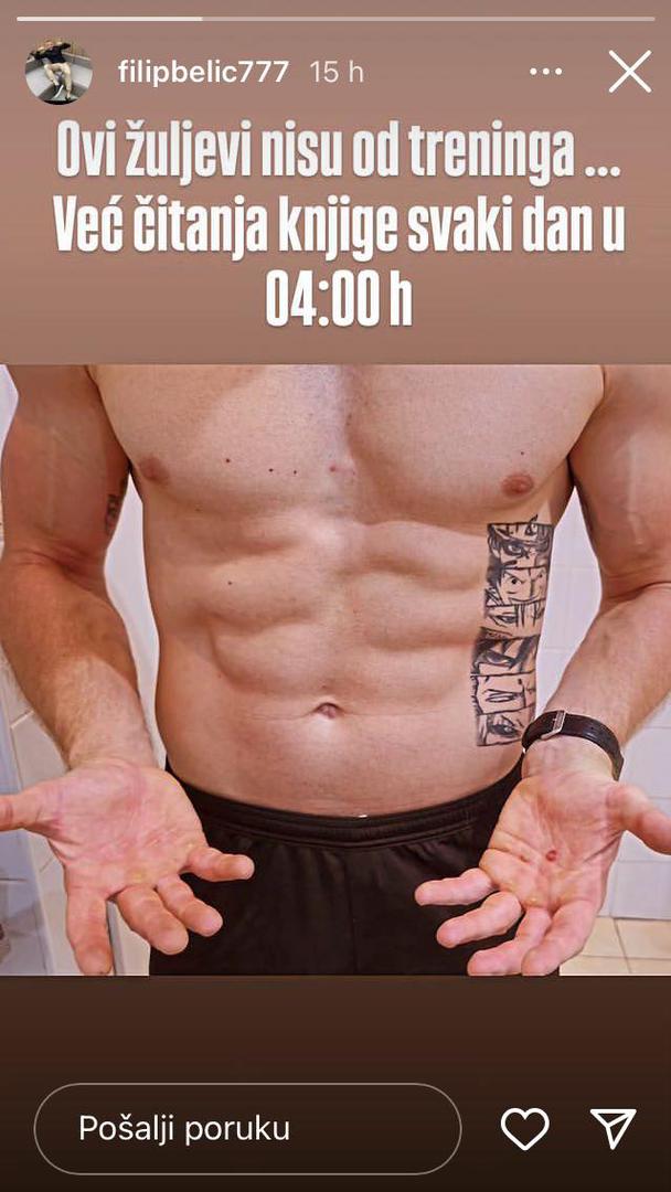 Filip je na Instagram priči objavio fotografiju svojih dlanova te priložio kontekst: - Ovi žuljevi nisu od treninga... Već čitanja knjige svaki dan u 04:00 sata - objasnio je svojim pratiteljima na ovoj društvenoj mreži, među kojima su i brojne zainteresirane prijateljice. One su mogle uživati i u ovom prizoru budući da je, bez obzira na opis, fokus ovaj put bio na njegovom mišićavom torzu. O zdravim životnim navikama Belić je nedavno progovorio za RTL.hr.